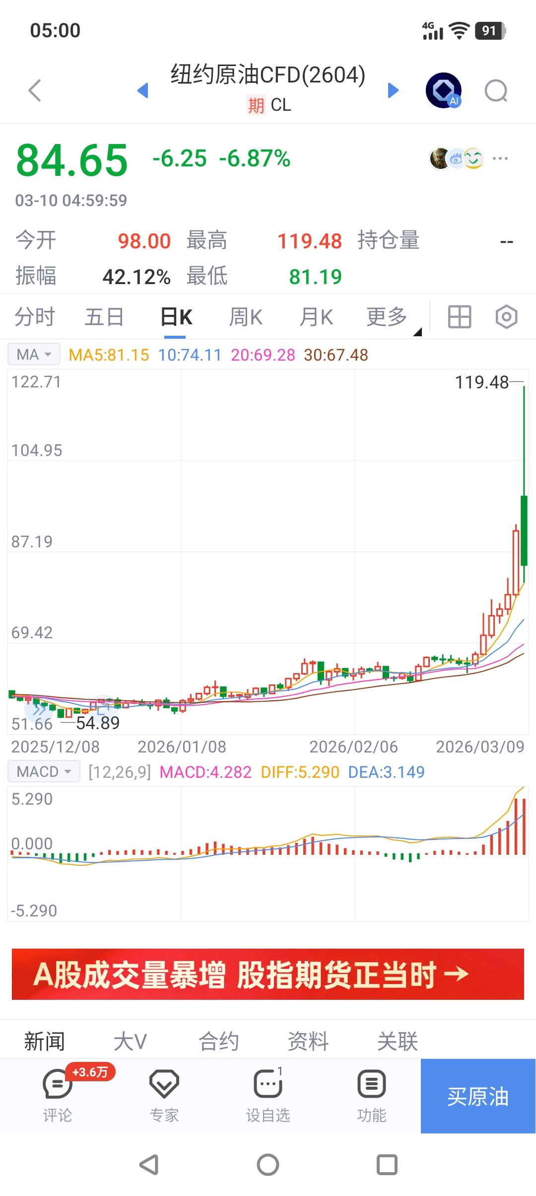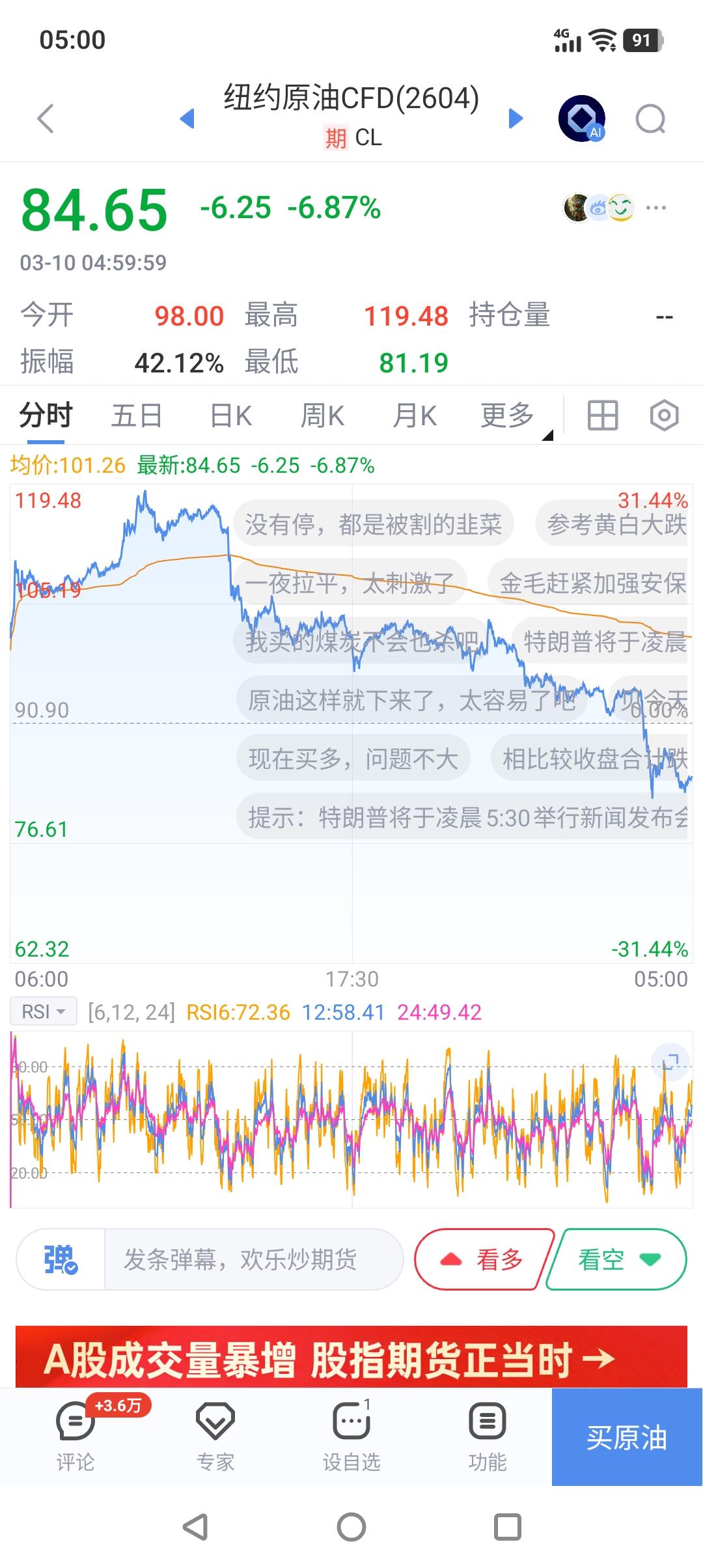 太刺激!油价跌破85美元。 截止今天早上5:00,纽约市场原油期货价格在85美元/桶下方波动。不到24小时,纽约市场原油期货价格从上涨近30%到下跌6%以上,波动之剧烈,堪比过山车。 上涨的理由很简单,中东战事升温;下跌的原因较复杂,有国际能源署打算释放石油战备库存的原因,也有白宫放风要尽快结束战争的因素在起作用。美伊战争很可能以交战各方都宣布取得胜利后戏剧般结束,目前唯一的障碍在特拉维夫。今天维特科夫和库什纳就要去见内塔了,如果能说服以色列收手,油价还有可能继续下跌。
