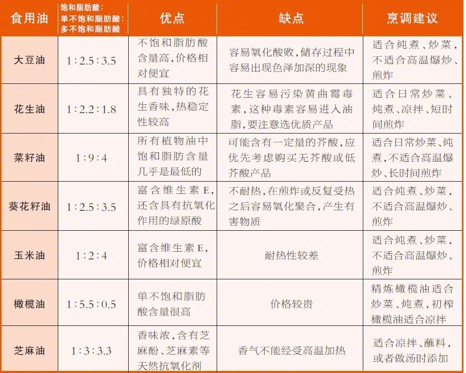 赣南医科大学基础医学院副教授曾炜建议,少吃猪油、牛油、棕榈油、椰子油等富含饱和脂肪酸的油脂;可适当吃玉米油、大豆油、葵花籽油;尽量选择菜籽油、橄榄油、茶油、亚麻籽油、紫苏油等,并勤更换品种。