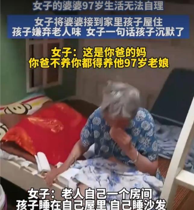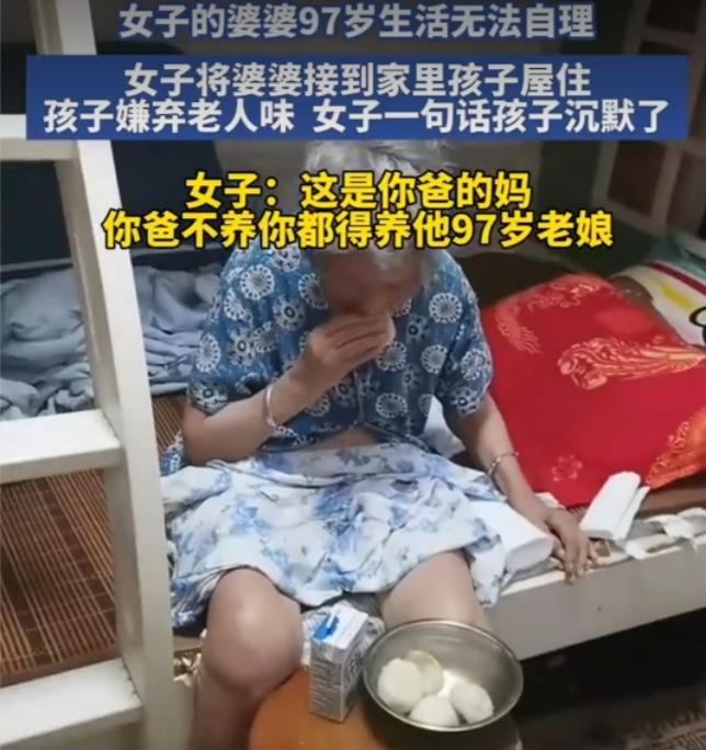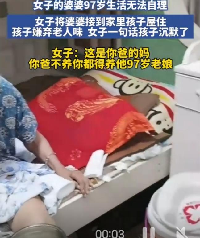 97岁婆婆住孙辈房间遭嫌弃,儿媳一句话怼哭孩子:这才是最扎心的家风 山东这位妈妈的做法,瞬间戳中了无数人的泪点。 孩子一句嫌弃“有老人味”,看似是小孩子的直白,却藏着最真实的人性——我们总习惯享受长辈的付出,却忘了他们也有老去、不便、甚至被嫌弃的一天。 老人97岁高龄,生活早已不能自理,身上的味道不是脏,是岁月留下的痕迹,是养育子女一辈子的疲惫。儿媳没有丝毫推诿,果断接回家照料,即便委屈了自己的孩子,也守住了为人子女的底线。 “你爸不养你,都得养他97岁老娘”,这句话没有半句大道理,却像重锤一样敲醒了孩子。 沉默的背后,是价值观的重塑。我们总教孩子要善良、懂感恩,可最生动的教育,从来不是书本上的文字,而是父母的一言一行。 嫌弃老人,是刻在骨子里的自私;善待长辈,才是一个家最珍贵的家风。 今天你嫌弃祖辈的衰老,明天你的孩子就会效仿你的冷漠。老人味可以散去,可家风一旦歪了,一辈子都难纠正。 这件事没有狗血剧情,却让无数人看完沉默反思。你养我小,我养你老,从来不是一句口号,而是刻在中国人骨子里的责任。 网友纷纷留言:这才是最硬核的家教,为这位儿媳点赞! 你觉得孩子该不该嫌弃老人?这位妈妈的做法,你支持吗?人老了以后,钱和子女哪个更靠谱? 父母老了,我们还能为他们做什么?