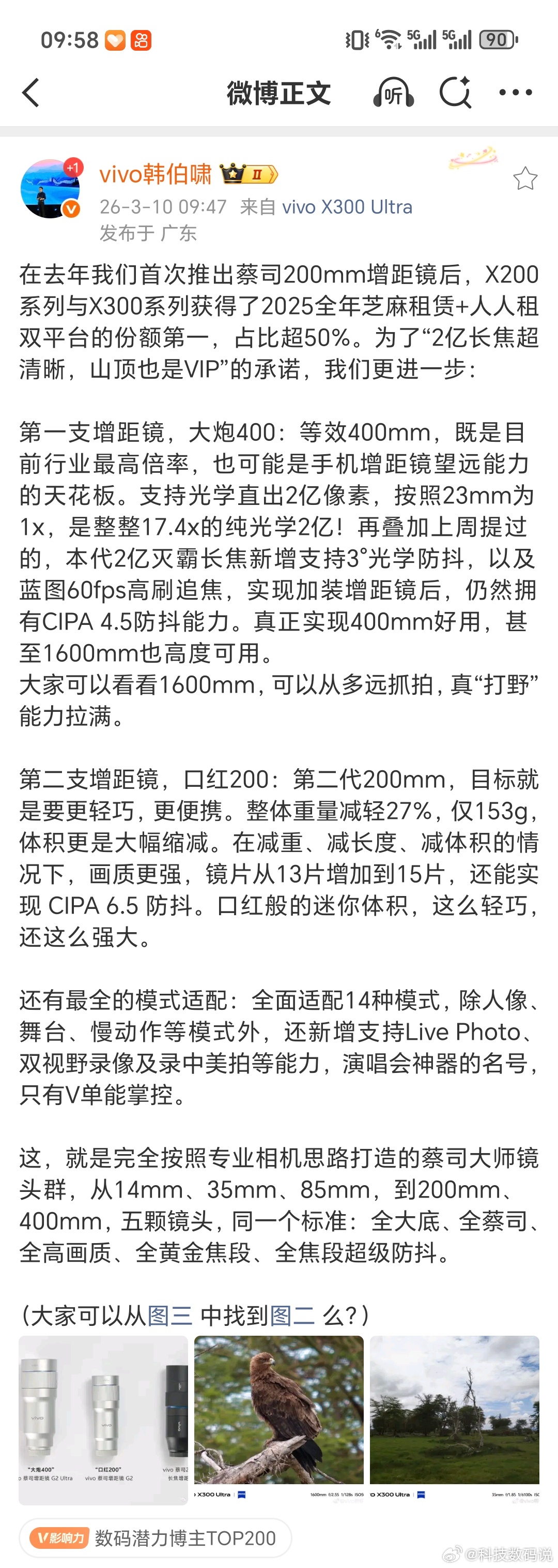 vivo把增距镜玩成了全民叫好,用过的都知道拍演唱会、球赛有多好用。因此vivo X300 Ultra简直太惊喜了,不但有光学变焦更远的大炮400mm的新增距镜,可以做到400mm-1600mm,更远、更好的防抖,演唱会更爽了。