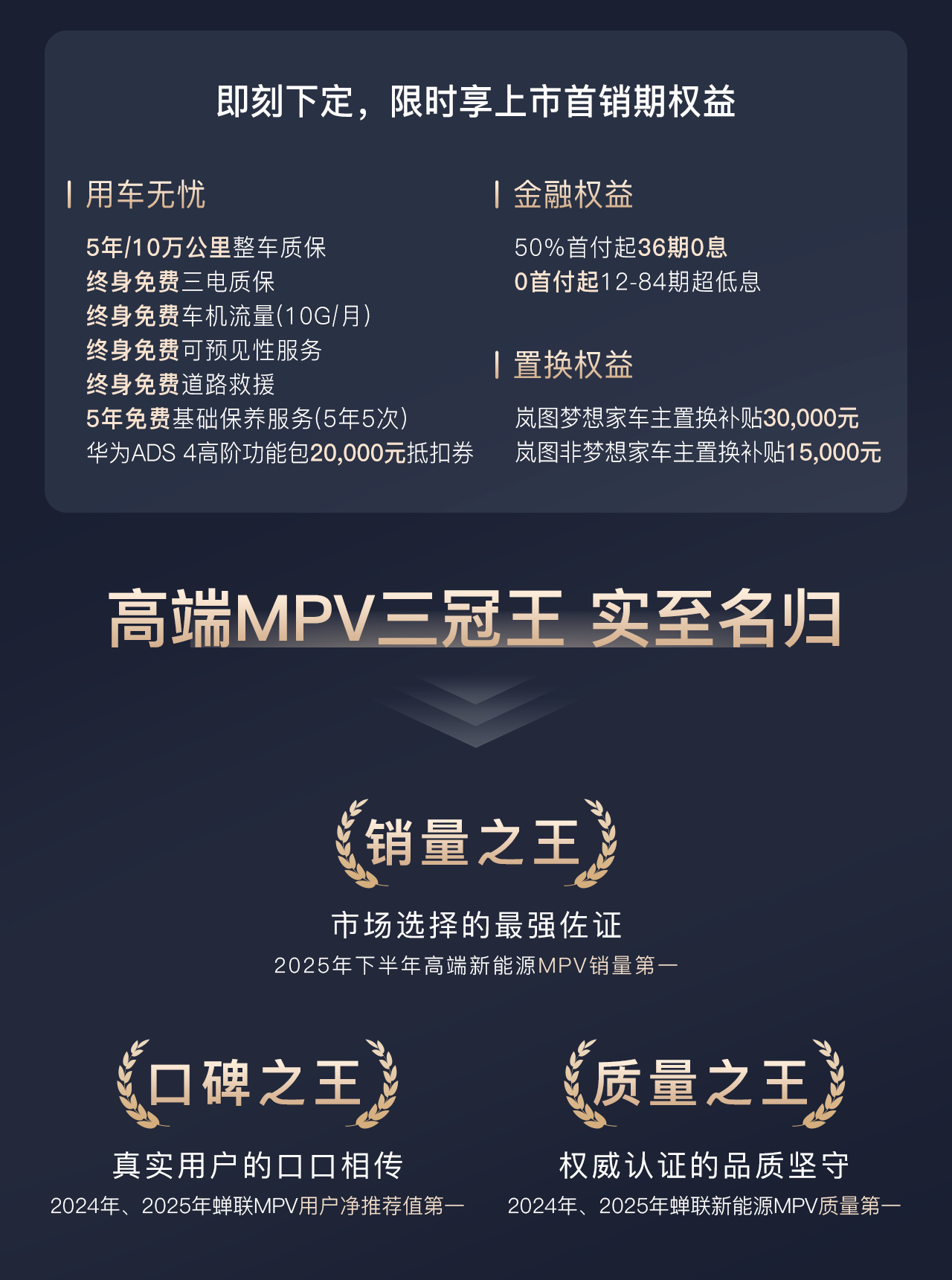 这个月岚图很忙,梦想家冠军版上市,岚图泰山Ultra交付,岚图泰山黑武士上市,岚图泰山X8跟着接棒,节奏真的很密集,年中有岚图FE,下半年有岚图珠峰,明牌开打。岚图梦想家冠军版上市30 万级搭载华为乾崑智驾的 MPV