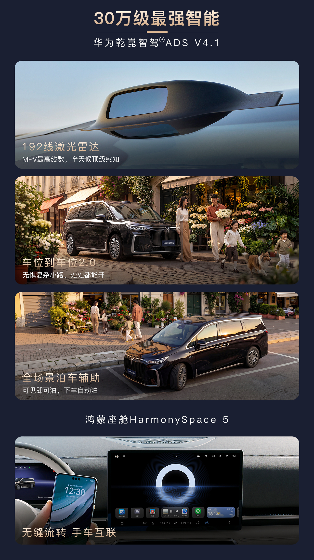 核心配置还是华为那套东西,ADS 4+鸿蒙座舱 5,但是价格卷下来了,30万级买华为全家桶MPV,这回怕您觉得商味太浓,前中网做了熏黑,后期再把其他镀铬的地方处理一下,家庭开又是一种新风格。