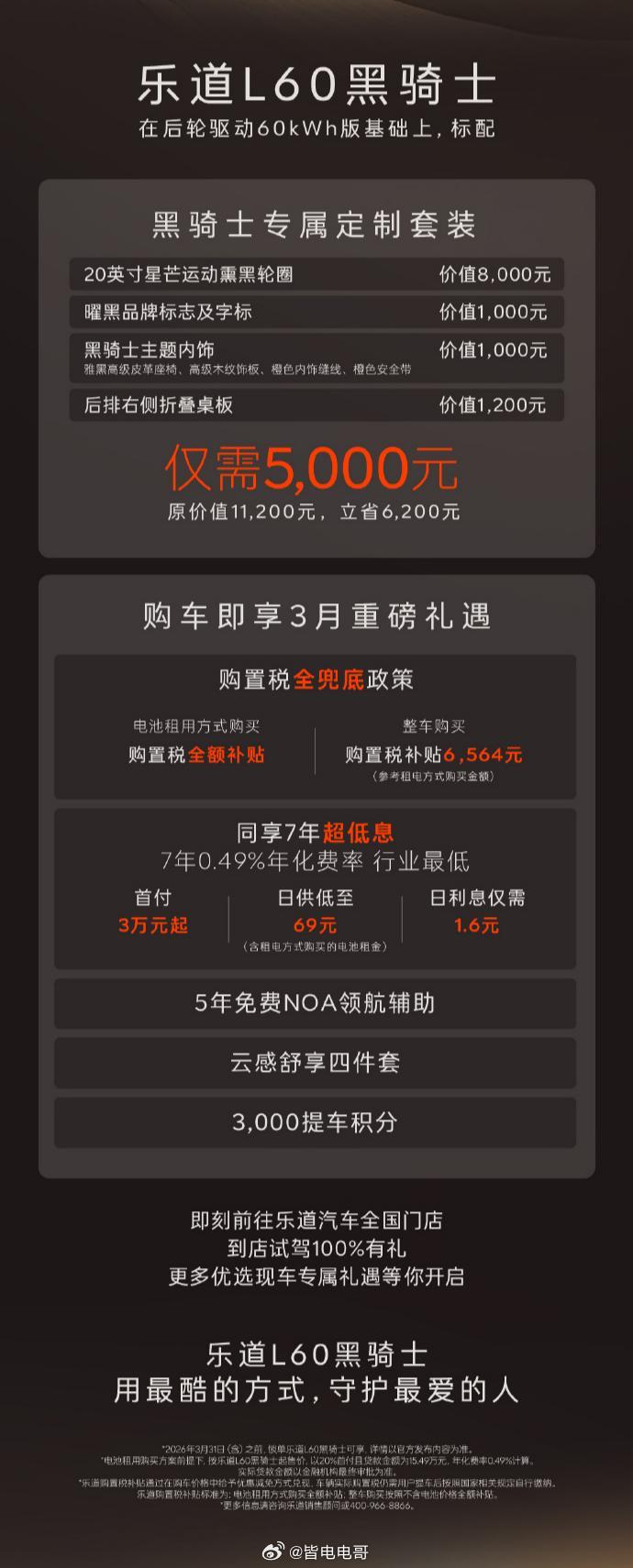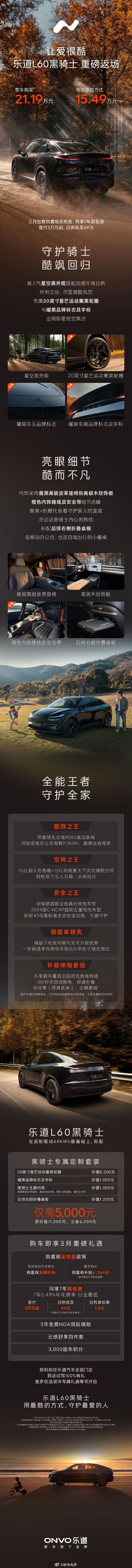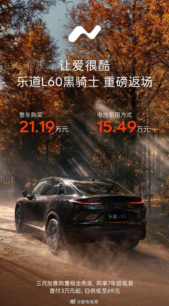 乐道L60 黑骑士重磅返场整车购买价格为21.19万元,电池租用方式15.49万元