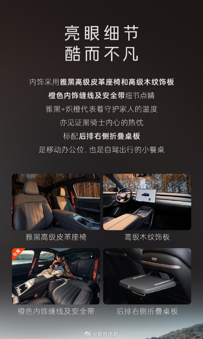 乐道L60黑骑士采用的是星空黑车色,搭载专属20英寸星芒熏黑轮毂内饰主要是采用雅黑高级皮革搭配大纹饰板