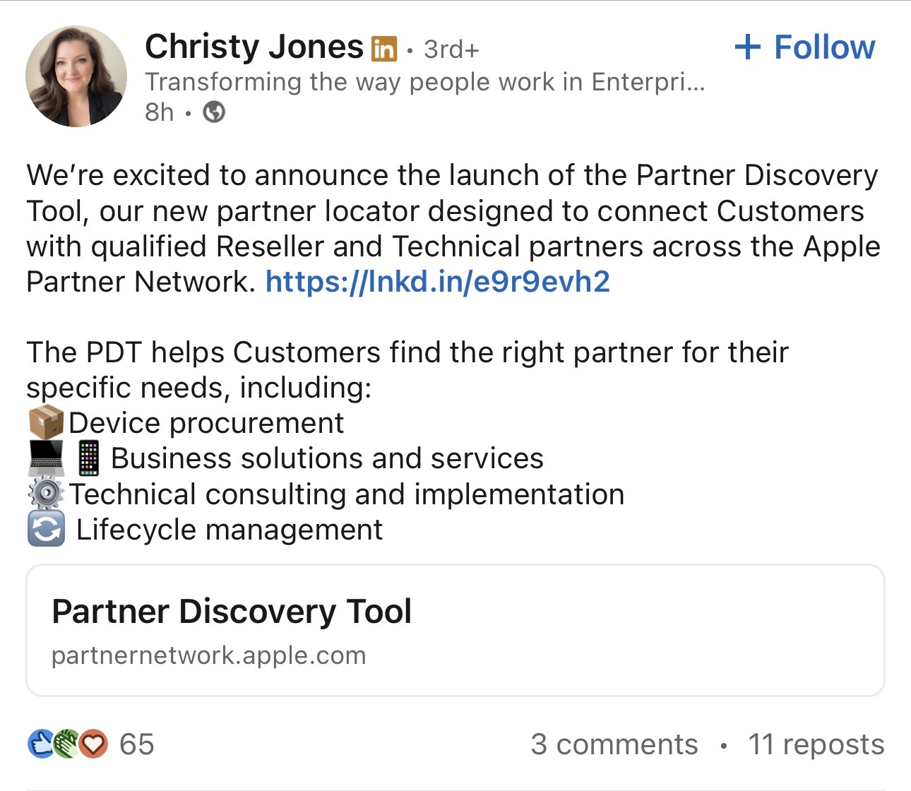 Apple 美国企业和政府销售主管 Christy Jones 今日在领英上宣布,全新的合作伙伴发现工具旨在将客户与 Apple 合作伙伴网络中合格的经销商和技术合作伙伴联系起来:
