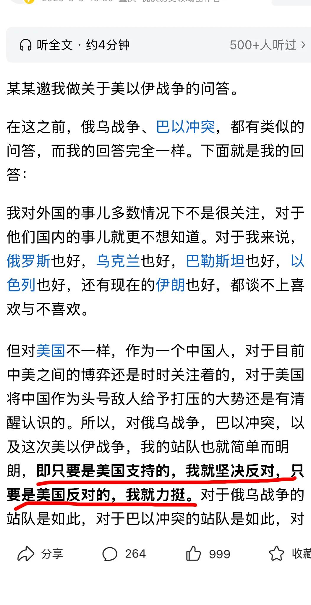 在头条读到这样的文章,还很有拥趸,真是个神奇的时代。 不用太较真反驳全文,只看这句黑体的: “即只要是美国支持的,我就坚决反对,只要是美国反对的,我就力挺。” 那很简单啊,问问你: 美国支持叙利亚现政权,你反对吗? 美国支持委内瑞拉现政权,你反对吗? 如果你反对,那你就要检讨下自己,是不是与国家站在同一立场; 或者,美国反对柬埔寨太子电诈集团,你力挺吗? 都什么年代了,还抱着两个凡是或两个只要什么的那一套,多无聊。
