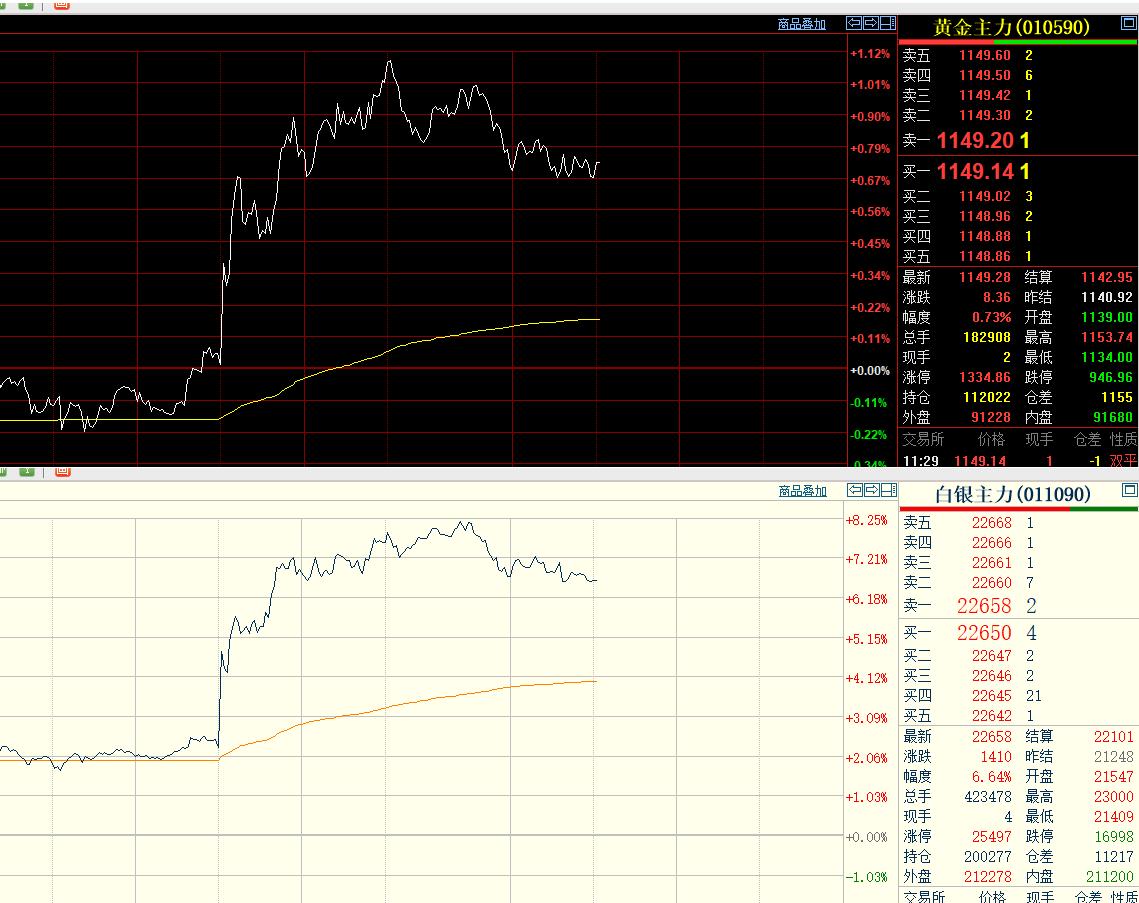 随着外盘的走强, 上午恢复交易以后, 特别是9点开盘伊始, 国内黄金和白银齐刷刷拉升。 上午更是偏强运行。 截止11:30分, 国内黄金期货停收于1149.28元; 白银期货停收于22658元, 较上一日上涨6.64%。 但是期货小褚认为, 贵金属上方面临较强压力!
