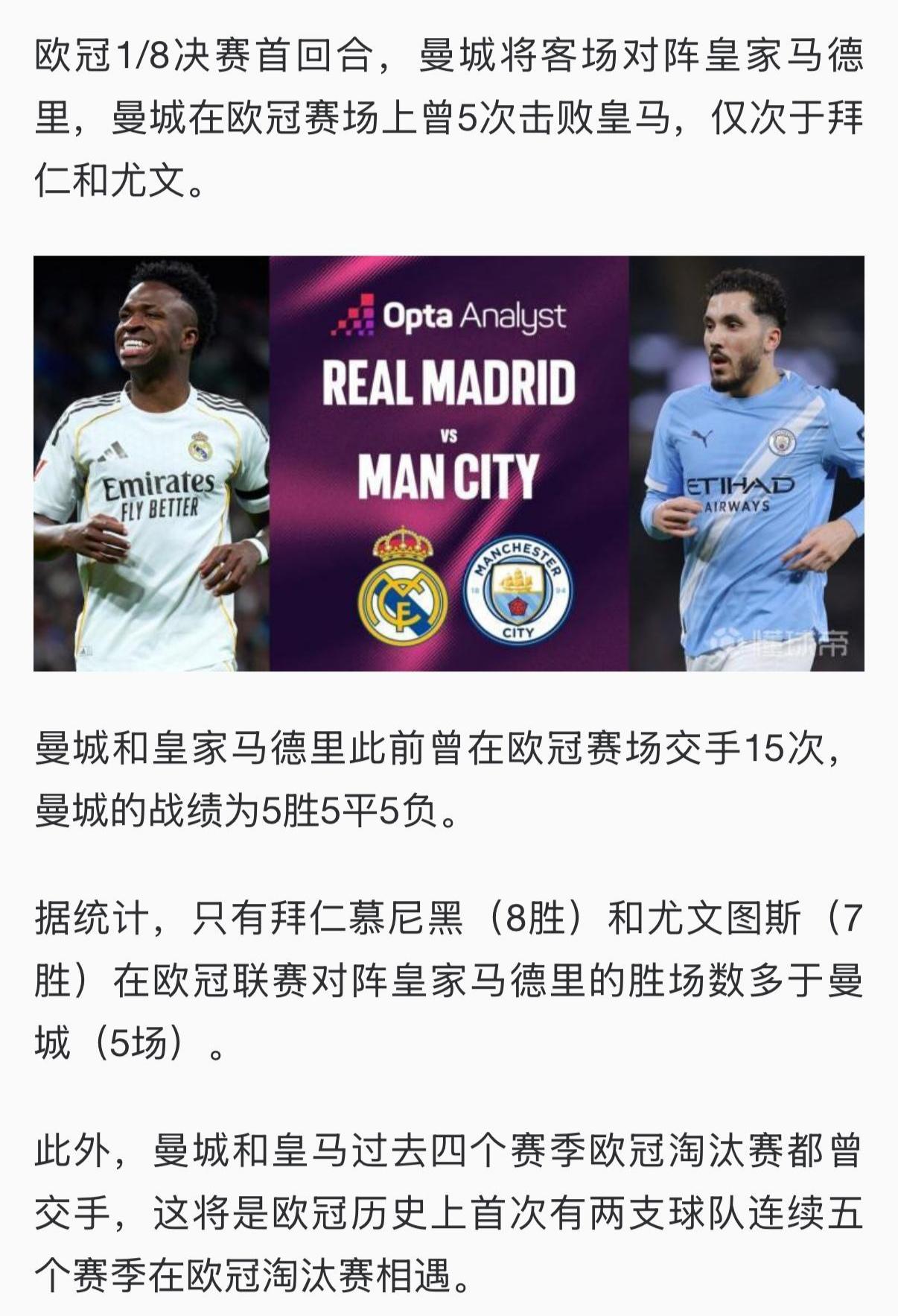 目前来看曼城赢皇马概率高,最近几次交手也都是曼城赢。 两队连续五个赛季相遇,应该都知根知底。 皇马输,本赛季四大皆空。 曼城输,这个赛季也不好过。 大家认为谁会晋级呢??[震惊]