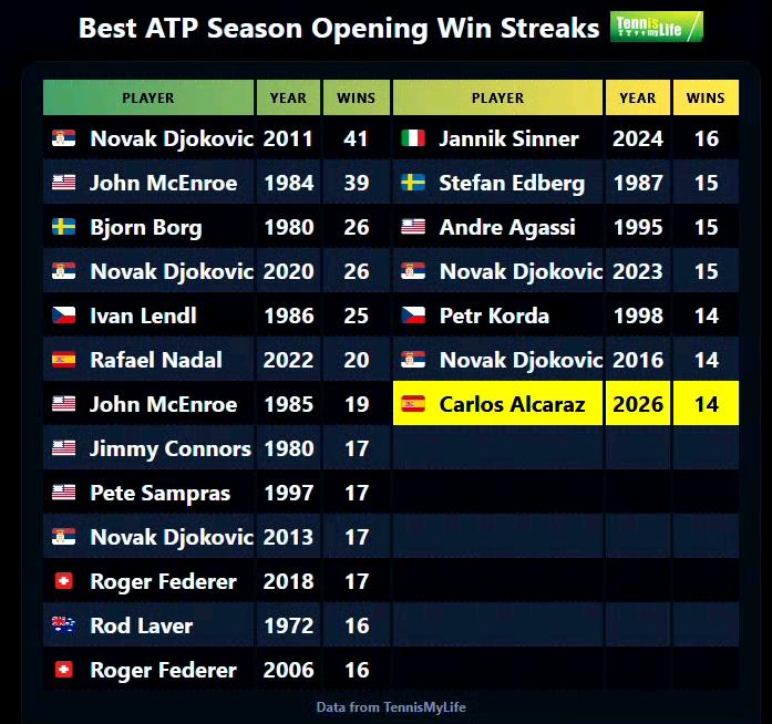 不经意间,阿卡本赛季已经14连胜了!如果今年IW完成第三冠,阿卡连胜纪录将来到18场。 但是距离德约在2011年的开年41连胜,2020年的26连胜,还是有一点差距。阻碍阿卡连胜的步伐只有辛纳了。 与费雷罗分手后,阿卡的性格奔放的一面展现的更充分,没有了强权管制,反而让他的网球更加收放自如。场外卡子更享受生活,目前来看自律精神没什么问题。