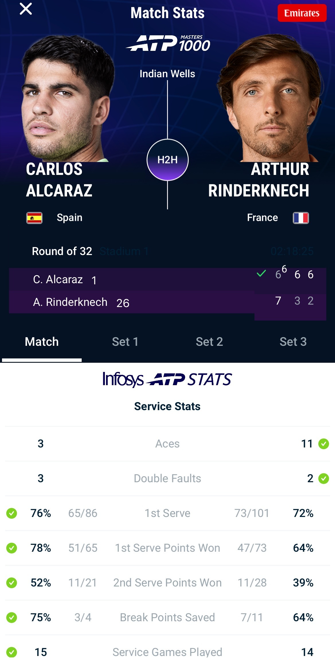 阿尔卡拉斯赛季14连胜 ATP1000印第安维尔斯站单打第三轮,世界第一阿尔卡拉斯以6-7(8)/6-3/6-2逆转战胜林德克内希晋级16强,豪取硬地14连胜,下一轮将战鲁德。