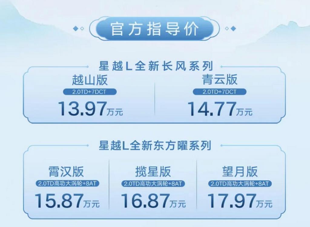【限时12.47万起,吉利星越L长风版上市】日前,吉利星越L长风版上市,新车共推出2款车型,售价区间为13.97-14.77万元,限时价12.47-13.27万元。此外,购车可享7年超低息等多重福利,包括包括星喜红包礼、星喜焕新礼、星喜金融礼、星喜质享礼、星喜保养礼和星喜流量礼等。此次上市的长风版为新增车型,依旧采用星越L经典的“时空交响”设计语言,前脸由直瀑式内凹格栅+熏黑套件组成,尾部则配备“极光点阵”贯穿式尾灯。车身尺寸方面,新车长宽高分别为4770/1895/1689mm,轴距为2845mm,定位A+级SUV。 内饰部分,该车配备2.3英寸液晶仪表+14.6英寸中控屏+14.6英寸副驾屏的,搭载高通骁龙8155车机芯片,并使用Flyme Auto车机,且融合Deepseek大模型,支持HUAWEI HiCar以及Carlink手机互联。动力方面,新车将会搭载一台2.0T低功涡轮增压发动机,最大功率160千瓦(218马力),最大扭矩325牛·米,与之匹配7挡湿式双离合变速箱,传动效率高达97%,换挡仅需0.2秒。而星越L·东方曜则配备2.0T高功发动机+爱信8AT变速箱,最大功率200千瓦,峰值扭矩400牛米,零百加速7.3秒。【来自懂车帝车友圈】