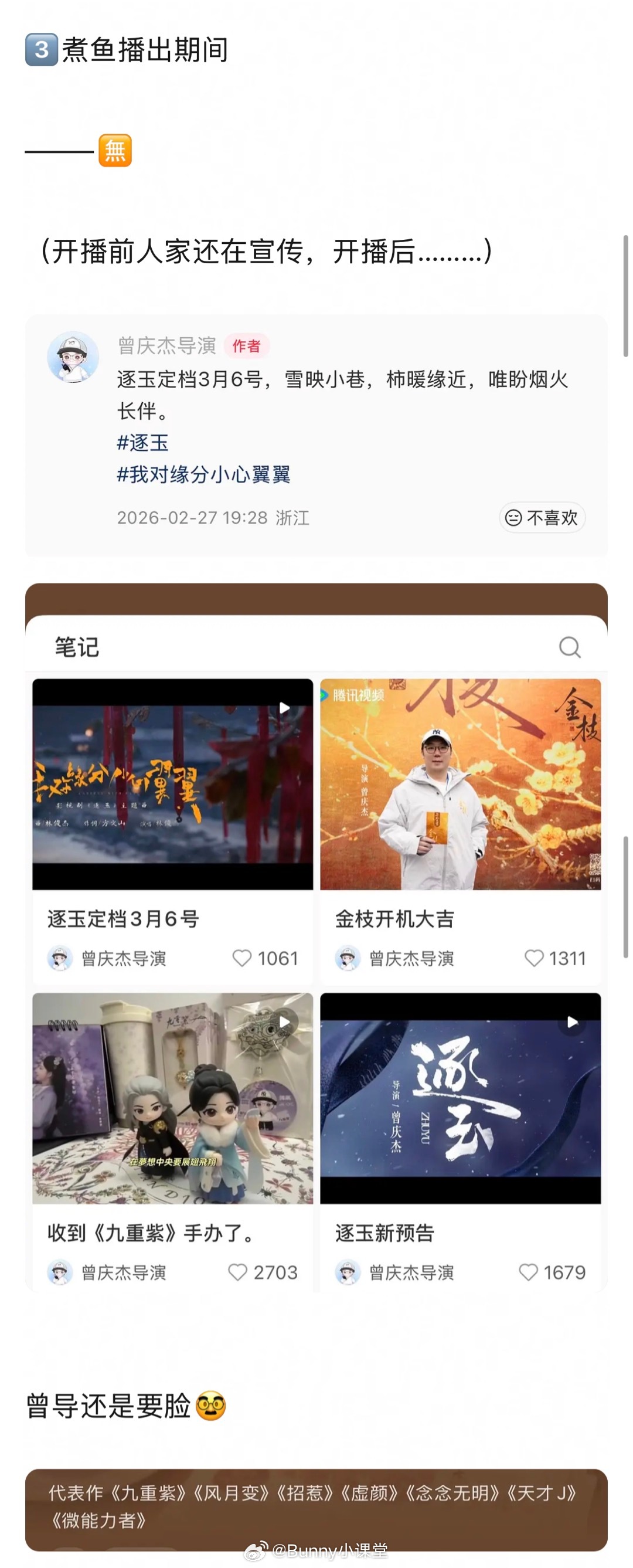 《逐玉》导演曾庆杰太幽默了,之前风月变、九重紫播出期间是各种发文,到了逐玉只有寥寥几篇定档宣传,甚至代表作里都没有逐玉……导演都知道躲起来