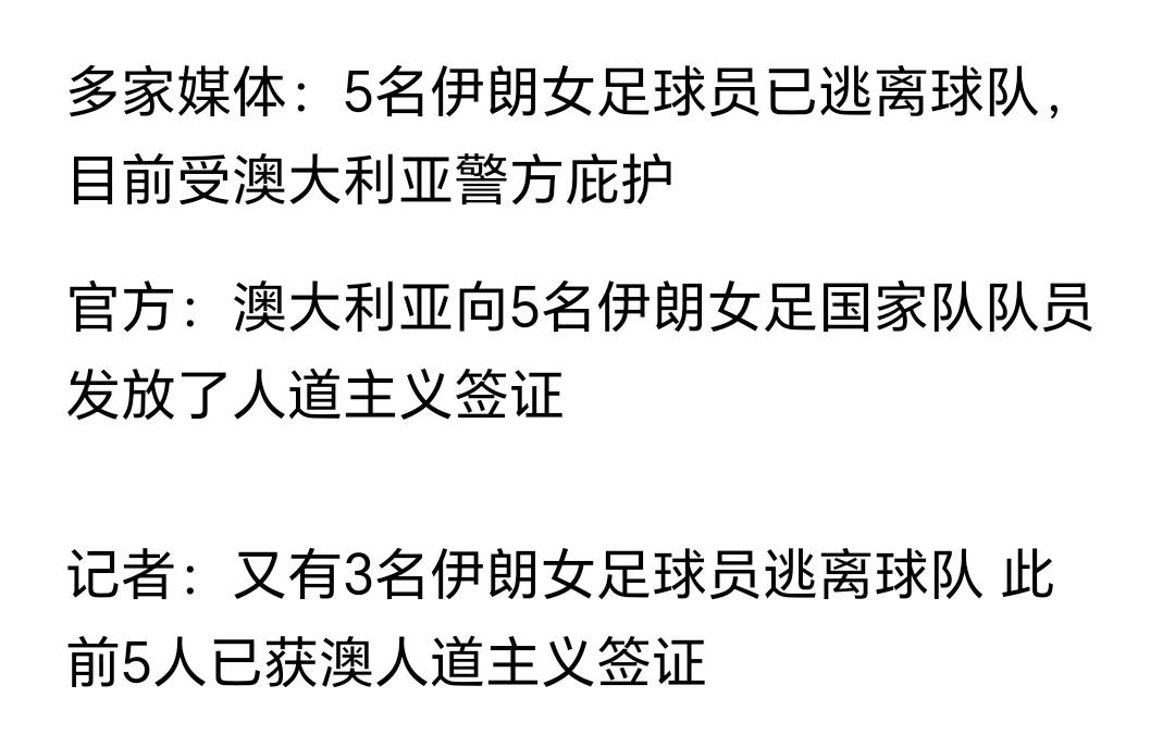 伊朗女足球员逃离球队?正在澳大利亚参加完亚洲杯的伊朗女足目前已经结束全部比赛任务,目前已经准备启程回国,但是已经有8名球员选择离开球队,其中5名球员已经获得澳大利亚签证,看样子是打算长期留在这里不回家了,这样的行为让人难以理解,出来参加比赛踢个球,怎么连自己的国家都不要了,有句话说得好,足球没有国界,但是足球运动员有自己的国家,为了所谓的自由抛弃自己的国家和信仰,连带着抛弃自己的亲人,这样的行为终究为人所唾弃!