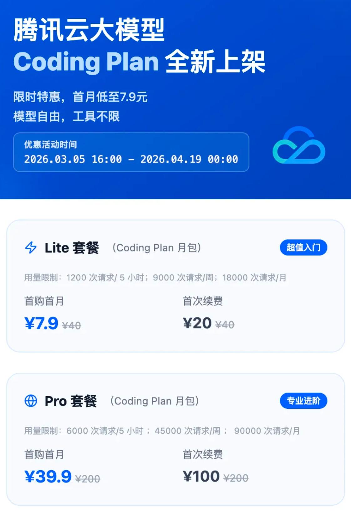 腾讯云开发者的大模型 Coding Plan 订阅服务正式上线。该服务集合了 Tencent HY 2.0、GLM-5、Kimi-K2.5、MiniMax-M2.5 等顶尖模型,并深度适配 Cursor、Claude Code 等主流编程工具。 💰 价格情报:活动价 vs 正常价 针对新用户,腾讯云推出了极具诚意的限时优惠。通过第二张图可见,活动期间订购可节省高达 80% 的成本。 💡 抢购提醒:优惠活动于每天 10:00 - 24:00 限量开放。一旦库存售罄,系统将自动切换回正常价。建议开发者调好闹钟,准时入场。 🌟 核心亮点一览 1.模型全家桶: 支持自由切换多款主流大模型,更多新模型持续接入中。 2.工具无缝衔接: 首发支持 Cursor、Cline、OpenClaw、Claude Code 等开发者神器。 3.硬核玩法推荐: 经实测,使用 Lighthouse 部署 OpenClaw 搭配 Coding Plan 调优,开发效率及体验更佳。