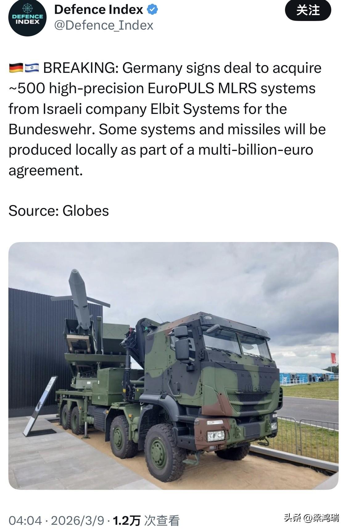突发新闻:德国与以色列埃尔比特系统公司签署协议,将为德国联邦国防军采购约500套高精度EuroPULS多管火箭炮系统。根据这项价值数十亿欧元的协议,部分系统和导弹将在德国本土生产。 uroPULS多管火箭炮,是一款“快、准、狠”的狠角色。它还有个名字叫MARS 3,是以色列埃尔比特系统公司和法德合资的KNDS公司联手打造的,专门针对欧洲战场需求做了优化。 这款火箭炮最厉害的地方,就是“快打快撤”,打完立马就能跑,不用担心被敌方反炮兵火力锁定,而且自动化程度极高,2到3个士兵就能操作,接到指令后不到一分钟就能完成发射,一小时能打12发火箭弹,机动性也拉满,最高时速能到90公里,续航里程超过750公里,不管是平原还是复杂地形,都能灵活部署。 德国自己有迪尔公司这样的军工企业,为啥还要找以色列合作?其实这不是德国第一次依赖以色列的防务技术了,早在之前,德国就先后从以色列采购过自杀式无人机、“长钉”反坦克导弹,还有能拦截洲际弹道导弹的“箭”-3防御系统,合作早就成了常态。 这次选择EuroPULS,一方面是这款火箭炮的性能确实能满足德国的需求,它能发射多种弹药,射程从35公里到近500公里不等,既能近距离火力压制,也能打击敌方纵深的高价值目标,刚好填补德国陆军远程火力的缺口; 另一方面,协议里明确要求技术和生产线部分转移到德国,这对德国来说可是稳赚不赔,既能拿到先进装备,还能带动本土军工产业,解决就业问题,何乐而不为。 这笔价值数十亿欧元的大单,具体金额大概在60亿欧元左右,折合成人民币差不多450亿元,可不是一笔小数目。 按照计划,这500套火箭炮,一半留给德国自己用,剩下的一半开放给北约盟友采购,相当于德国借着自己的采购规模,牵头打造一个北约多国联合采购体系,既降低了自己的采购成本,还能提升北约整体的地面火力打击能力。 不过这事也引来了一些质疑,有德国议员就表示,德国现在在防务技术上越来越依赖以色列,长远来看可能会影响自身的军工自主能力。 从时间线来看,这份协议预计会在2026年下半年提交德国议会审议,一旦通过,最快2027年就能实现批量生产,到2030年,德国联邦国防军就能收到大部分配套导弹。 对于以色列来说,这也是一笔大生意,埃尔比特系统公司作为以色列的核心防务企业,这笔订单不仅能让公司营收大幅提升,从最近的股价就能看出来,近三个月公司股价涨了80%多,可见市场对这笔订单的看好。 德国花大价钱买火箭炮,本质上还是为了重整军备,应对当前复杂的国际安全环境。俄乌冲突以来,欧洲各国都在加大国防投入,德国作为欧洲经济强国,自然也不甘落后。 这笔与以色列的合作,既是一次简单的装备采购,更是德以防务合作的进一步升级,也让我们看到,在当下的国际局势中,军工合作早已成为国家之间拉近关系、提升自身实力的重要方式。 而对于普通大众来说,这样的大额军火交易,也从侧面反映出,和平从来都不是理所当然,背后需要强大的国防力量来守护。