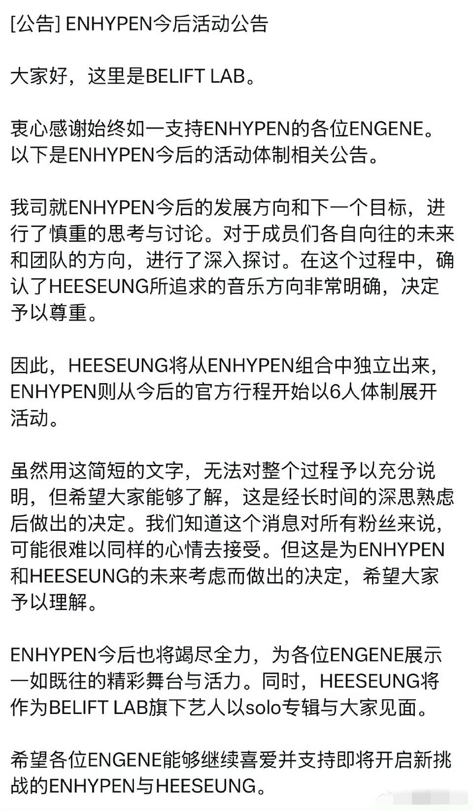 李羲承退团,韩娱的“七人魔咒”又应验了? 310这天韩娱粉估计都懵了。那边ZB1刚宣布解散,这边JYP朴振英本人辞职,结果BELIFT LAB quietly甩出一颗深水炸弹:ENHYPEN李羲承退团,专注个人音乐事业。 说quietly一点不夸张,公告就几行字,连个缓冲期都没给。官方说法是“尊重李羲承明确的个人音乐方向”,李羲承手写信也体面,说不想把个人欲望凌驾团队之上。 但这话细品全是问号。 一个出道六年的当红团体,一个公认的核心主唱+门面+创作成员,一个刚用红发造型和科切拉全开麦舞台带飞组合的断层大TOP,就这么毫无征兆地“被独立”了?合约没问题,健康没问题,人还在老东家,那问题出在哪儿? 说白了,韩娱这么多年能同时跑团体和个人赛道的solo一抓一大把,公司凭什么非得让他二选一? 除非裂缝早就存在。 翻翻粉丝这些年列出来的“罪状”——MV镜头垫底、原创作品署名争议、资源分配像抽盲盒……这些积攒的情绪,在退队公告出来的那一刻全炸了。有人翻出当年的占卜预言感叹玄学,有人直接调侃“七人男团魔咒”再次应验。 我倒觉得,这事没绝对的对错。李羲承想飞,团队要稳,公司要利,粉丝要情。四方博弈,各有立场。 只是那句“不想在团队里只把自己的欲望放在最前面”,听着有点心酸。他想做的,团队已经装不下了。 至于未来?六人ENHYPEN怎么重新洗牌,李羲承solo能不能杀出血路—— 路还长,别急着下结论。