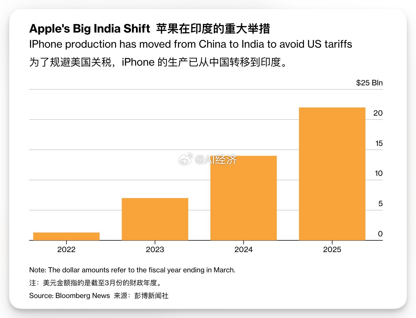 苹果已经将印度产iPhone的占比提高至四分之一。彭博社援引数据报道,苹果2025年在印度约生产5500万部iPhone,较去年(3600万部)增加超过50%,约占全年2.2亿部产量的25%。美国关税对苹果在中国生产施加阻力。