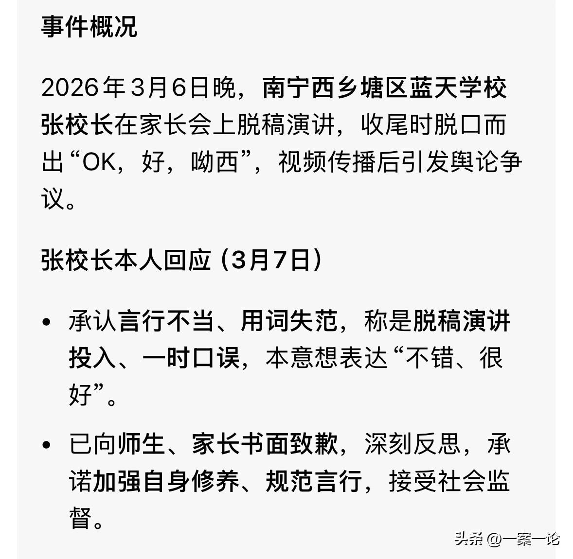 “闹大了!”广西南宁,一校长在家长会上发言,可讲到激动处时,他竟脱口而出一句“呦西!”,这让在座的家长们听完面面相觑……作为校长,竟把这句话当作口头禅,这让所有人都觉得不可思议。 3月6号晚上,一所学校里家长会正开得热闹。 台下坐着的都是学生家长,台上站着的是学校校长。 本来家长会就是老师讲成绩、提要求的严肃场合。 可这位校长那天显然是上头了。他没照着稿子念,把讲稿一扔,开始脱稿演讲。 只见他情绪高涨,脸上泛着红光,手势挥得呼呼作响。 讲到激动处,他大声号召台下的家长们给领导鼓掌,那气氛烘托得相当足。 可就在最后收尾的时候,校长脱口而出一句话,让底下的家长们震惊不已。 也许是觉得光说“好”不够劲,也许是脑子那一瞬间短路,这位校长对着麦克风,顺嘴溜出了三个字:“呦西!”紧接着还补了一句“好”。 这一嗓子,直接把在场的家长给喊懵了。 空气瞬间凝固了几秒,底下坐着的家长们面面相觑,眼神里全是问号和错愕。 大家心里估计都在犯嘀咕:这是啥情况?开家长会怎么冒出句日本话? 这段也就10秒钟的视频,被家长发到了网上,这下真是议论纷纷。 大家伙儿的第一反应不是“这校长挺幽默”,而是“这校长咋想的?”。 “哟西”这词啥意思?那是日语啊!那段历史,那是刻在骨子里的痛。 在学校这种教书育人的地方,在家长会这种正经场合,一个中国校长,张嘴蹦出个这词儿,这不仅仅是不合适,简直是往大家的伤口上撒盐。 这让网友们看后直呼刷新了三观,这还是校长吗? 还有人说:“说‘OK’顶多是装洋蒜,说‘呦西’在那个年代就是汉 奸,现在虽然不论罪,但在校长这个位置上,这就等同于犯罪! 舆论发酵得太快,涉事校长估计也吓出了一身冷汗。没过多久,他赶紧出来道歉了。 在道歉视频里,这位校长没了家长会上的意气风发,弓着背,态度看着挺诚恳。 他解释说,当时太激动了,纯属口误,绝对没有坏心眼,就是想表达“好、很棒”的意思,没想到犯了这么大的忌讳。 他对着镜头给家长、给师生鞠躬,连说对不起。 但网友们并不全买账。有人就在评论区怼回去:正经人谁会在严肃场合顺口说出‘呦西’?这就是潜意识里的东西,别拿口误当挡箭牌! 还有人认为,你一个搞教育的,嘴上没个把门的,怎么教孩子爱国? 确实,大家生气不是没道理。校长是啥人?是学校的魂,是孩子的榜样。你的一言一行,几百双眼睛盯着呢。 在家长会上号召鼓掌,本来是为了尊重领导,结果一句“呦西”,把这份尊重全给败光了,反而让人觉得阴阳怪气,心里发毛。 现在当地部门已经介入了,正在处理这事儿。这位校长大概率要挨处分,甚至可能丢饭碗。 公家场合,嘴上真得有个把门的。尤其是涉及到历史和民族感情的词,那是高压线,碰都不能碰。 一句所谓的“口误”,毁掉的可能是一辈子的职业声誉,还有大家对教育环境的信任。 《公职人员政务处分法》第40条第1款第(六)项规定:违背社会公序良俗,在公共场所有不当行为,造成不良影响的,予以警告、记过或者记大过;情节较重的,予以降级或者撤职;情节严重的,予以开除。 涉事校长作为公立学校管理者,属于法律规定的“公职人员”。 他在家长会这种公共场合,脱稿使用具有特殊历史背景和敏感色彩的日语谐音词“呦西”,虽辩称系“口误”,但客观上已触碰民族情感底线,引发舆论哗然,严重违背了社会公序良俗。 校长不仅是行政管理者,更是师生的道德标杆。他在严肃场合的不当用语,不仅损害了个人形象,更对学校声誉及教育系统的公信力造成不良影响。 教育部门的介入及后续处理,正是基于该法条对违背公序良俗行为的零容忍。 对于这件事,你怎么看? 欢迎关注@一案一论