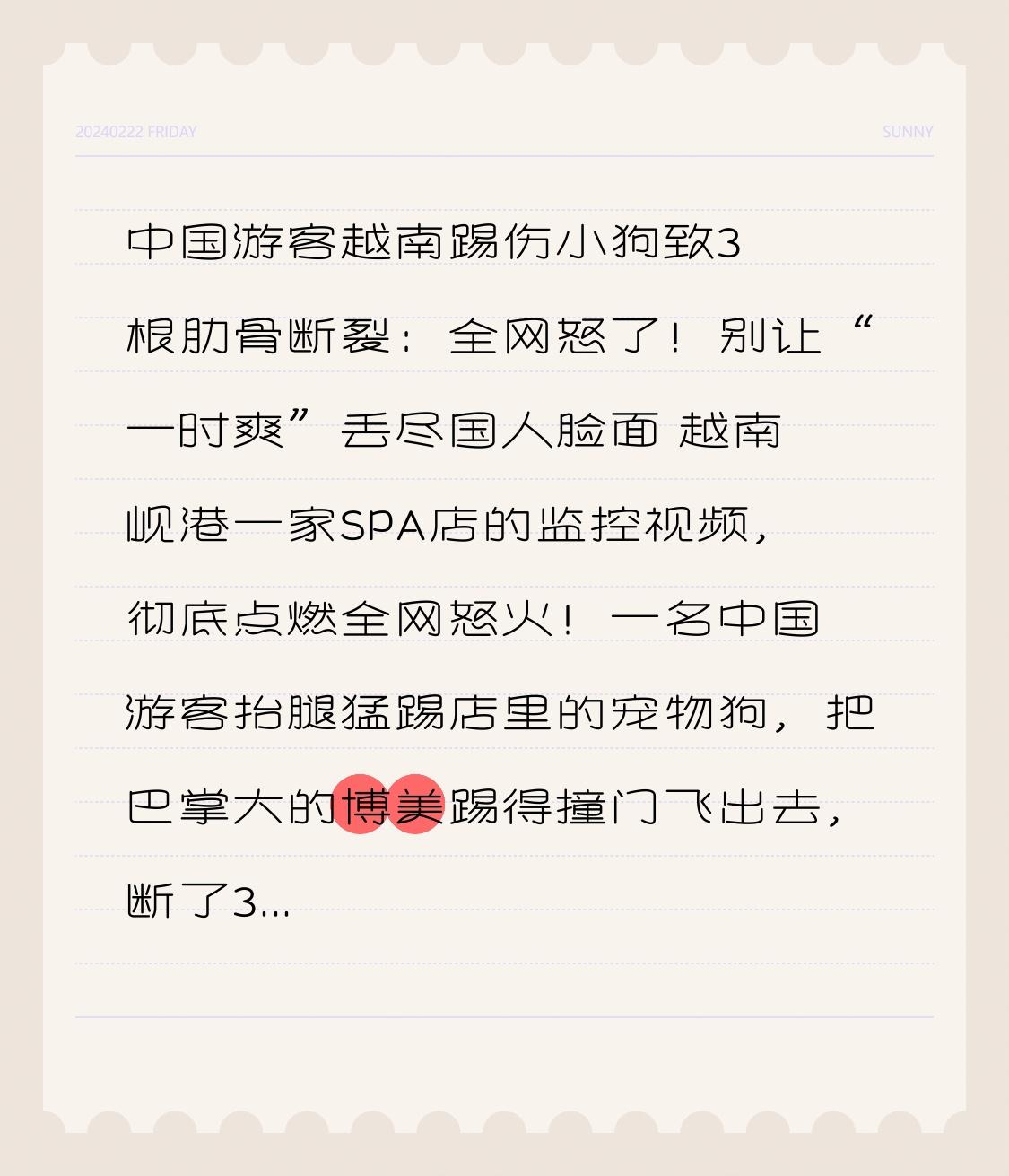 中国游客越南踢伤小狗致3根肋骨断裂:全网怒了!别让“一时爽”丢尽国人脸面 越南岘港一家SPA店的监控视频,彻底点燃全网怒火!一名中国游客抬腿猛踢店里的宠物狗,把巴掌大的博美踢得撞门飞出去,断了3根肋骨,施暴者竟淡定离开,同行同伴全程低头玩手机,仿佛什么都没发生。这一幕,看得人血压飙升! 事情发生在3月7日下午,两名中国游客到SPA店等候,当时店里恰好无人。一只店家养了多年、像家人一样的博美,正安静趴在门口晒太阳。谁也没想到,其中一名游客突然起身,对着无辜的小狗狠狠一脚踹下。小狗惨叫着被甩飞几米远,重重撞在门上,随后躺在地上不停颤抖,肋骨断裂的剧痛让它连站都站不稳。 店家妻子15分钟后返回,发现小狗痛苦哀嚎,立刻送医救治。X光片清晰显示:小狗3根肋骨断裂,可因体型太小无法打石膏,只能靠药物止痛、静待自然愈合。多年陪伴的家人遭此毒手,店家又心疼又愤怒,治疗费用全由他们承担,而施暴者早已不见踪影。 本以为只是个别冲动行为,神转折来了!这段监控视频被曝光后,全网瞬间炸锅!越南网友痛斥暴行,要求追查施暴者;国内网友更是直言“丢尽国人脸面”。但也有清醒声音跳出:别一棍子打死所有中国人!不能因为两个人的恶行,给整个群体抹黑。这不是地域偏见,是对暴行的零容忍,是对生命尊重的底线! 小狗还在承受痛苦,它可能不明白,为什么刚刚还在阳光下的温柔世界,突然变成了地狱。而那两名游客,用最粗暴的行为,把“文明出游”四个字踩得粉碎。出门在外,你的一言一行,都代表着国家形象。不是去异国他乡就能“放飞自我”,更不是因为动物不会说话,就能肆意发泄戾气。 尊重生命,是做人的基本底线;文明出游,是出国的必备素养。一只小狗的伤痛,是对人性的拷问;一段视频的发酵,是对文明的提醒。 希望相关部门能尽快介入,找到施暴者,让他们为自己的行为付出代价,给店家、给小狗一个公道!也请每一位中国人记住:走出国门,你就是中国的名片。别让一时的冲动,毁掉国人的整体形象;别让无知的暴行,伤害无辜的生命。 对于这件事,你怎么看?觉得该如何约束出国游客的行为?评论区聊聊!