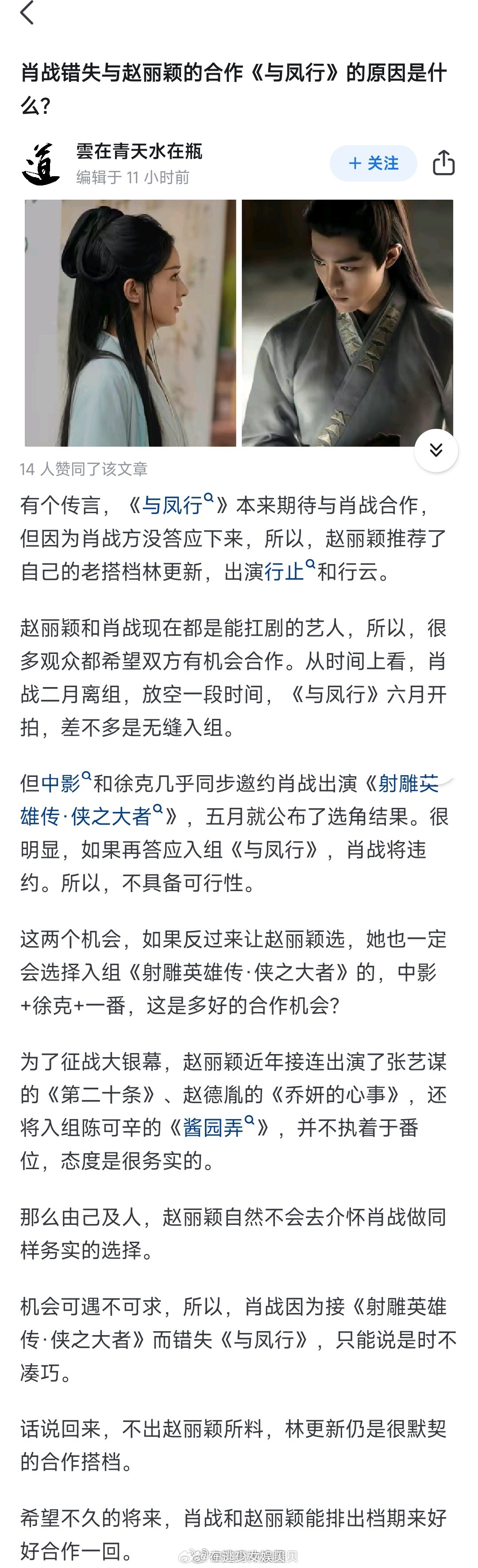肖战错失和赵丽颖合作《与凤行》的原因是这个?