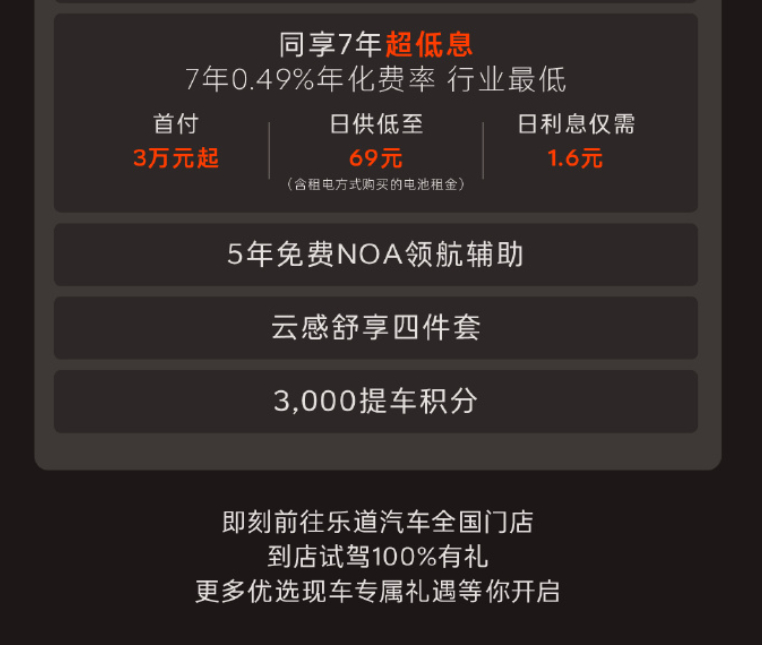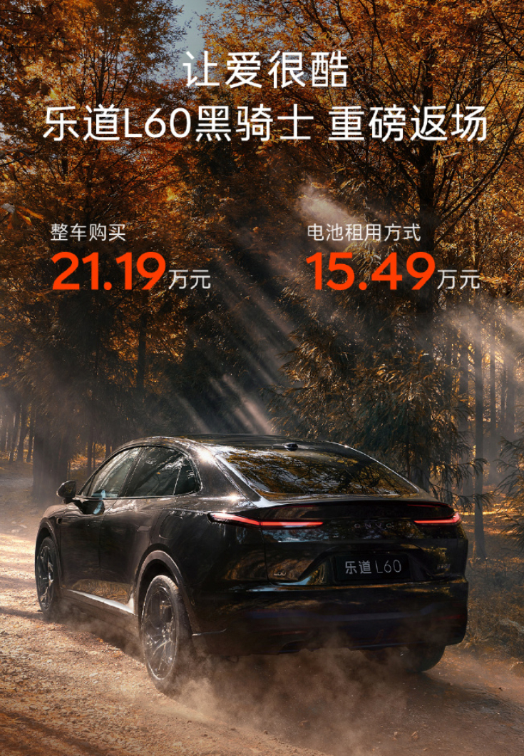 车若初见 还是原厂黑武士省心,乐道L60黑骑士返场,整车购买价21.19万,租电方案15.49万,去年666台限量发售秒卖空,现在不限量订购,外观星空黑配真皮内饰雅黑,20英寸星芒熏黑轮毂+全车曜黑处理品牌标识,内饰橙线点缀。3月中下旬开启交付,购车有购置税兜底政策,首付最低3万元,7年低息方案,日供69元。