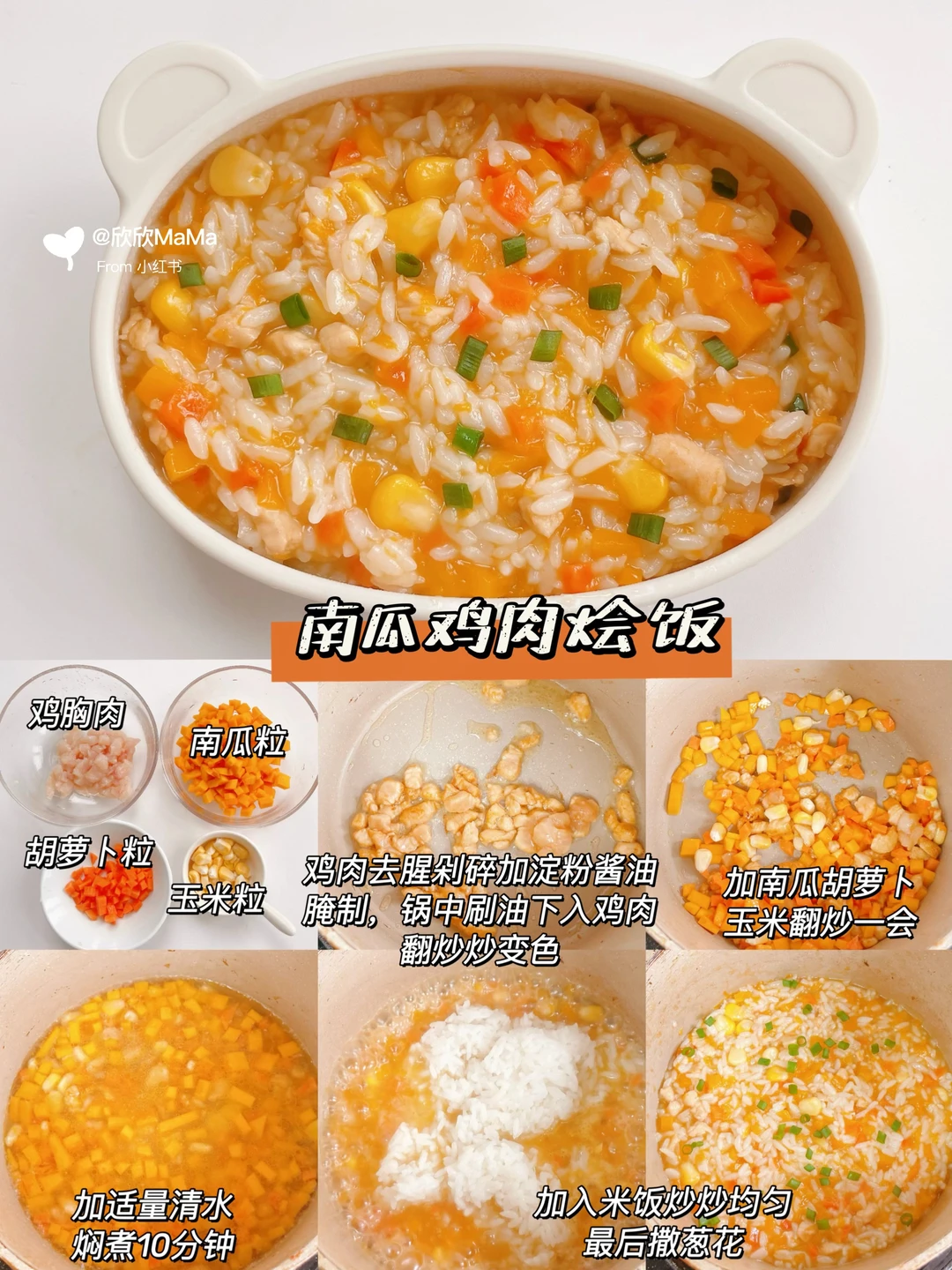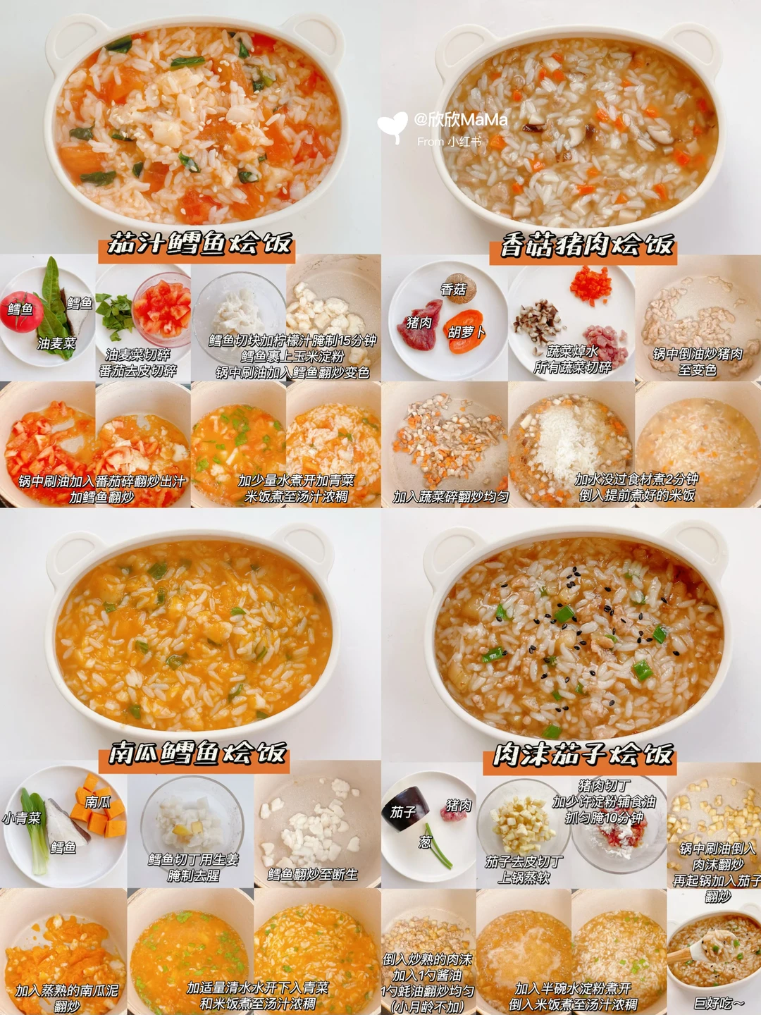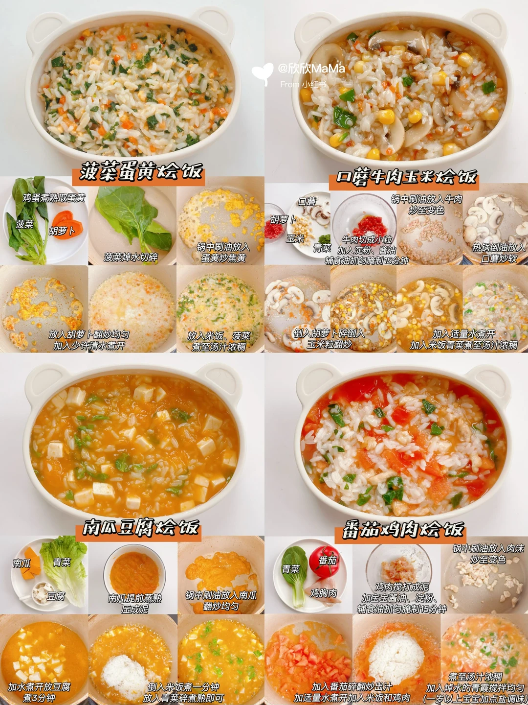 烩饭不像炒饭,会带点汤,也是从稀饭过度到米粉的一个很好的选择,也能很好的帮助宝宝锻炼咀嚼能力,也是自主进食的好帮手,因为烩饭能比较好的黏在勺子上,能让刚开始训练勺子的宝宝得到更好的锻炼。