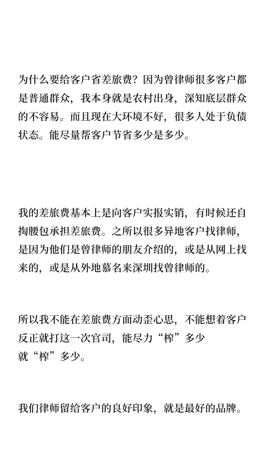 为什么要给客户省差旅费?因为曾律师很多客户都是普通群众,我本身就是农村出身,深知底层群众的不容易。而且现在大环境不好,很多人处于负债状态。能尽量帮客户节省多少是多少。