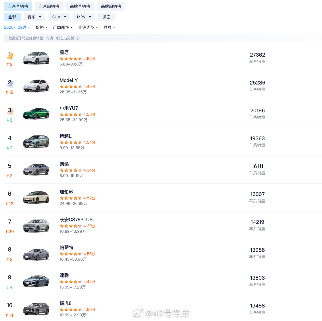 2026年2月的销量排行出来了。TOP10里有让你意外的车型吗?42ho
