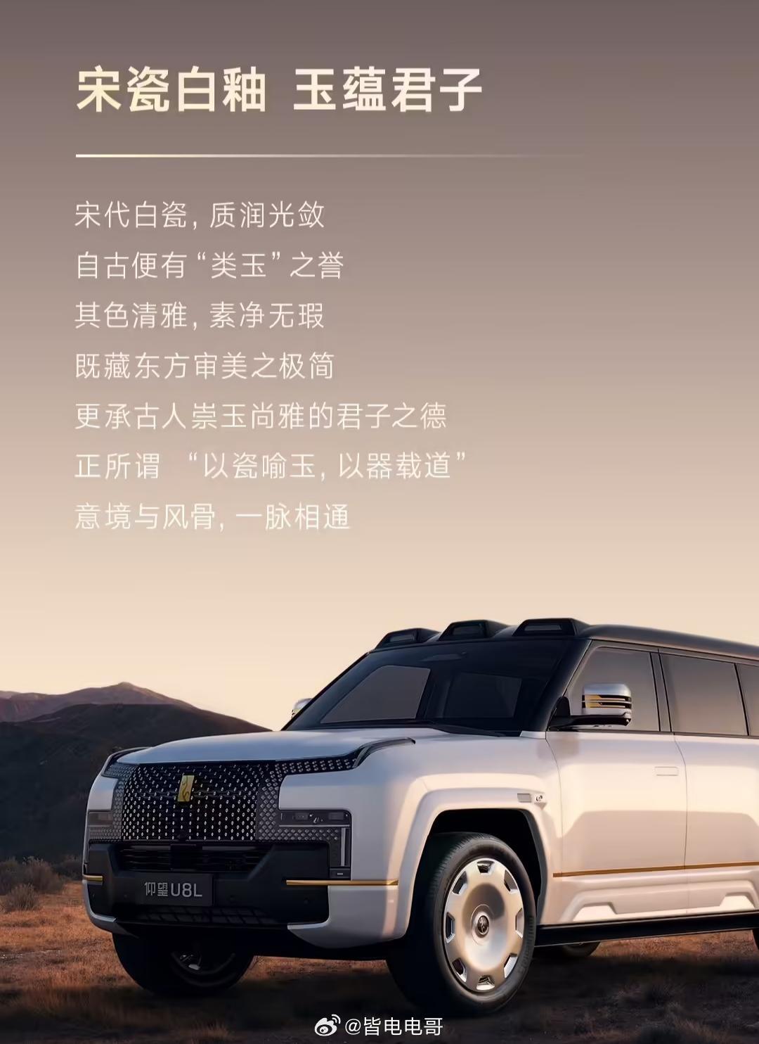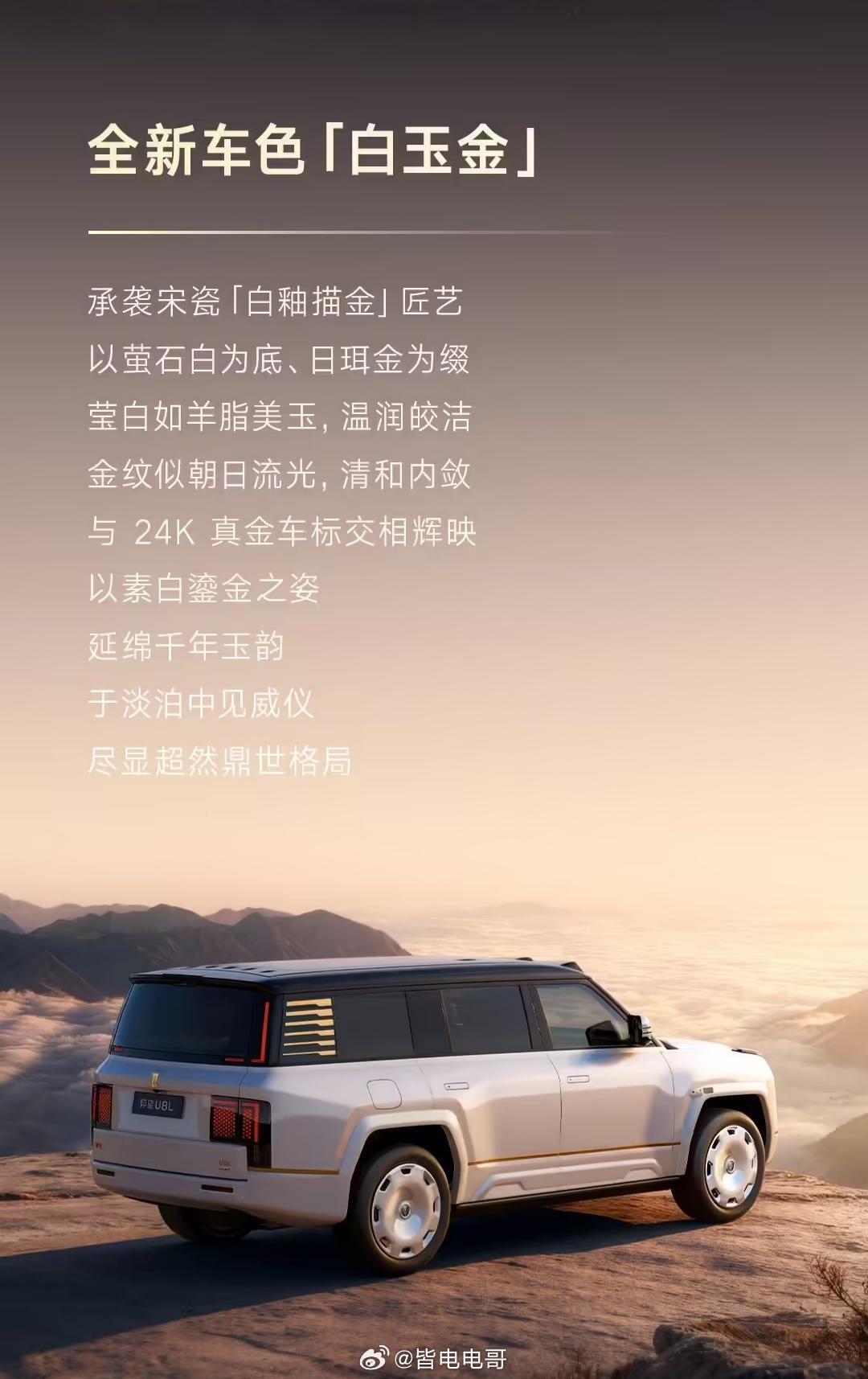 仰望U8L全新配色“白玉金”上线这个配色看着就舒服和干净,而且该色承袭宋瓷「白釉描金」匠艺,以萤石白为底、日珥金为点缀