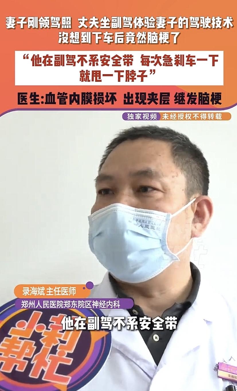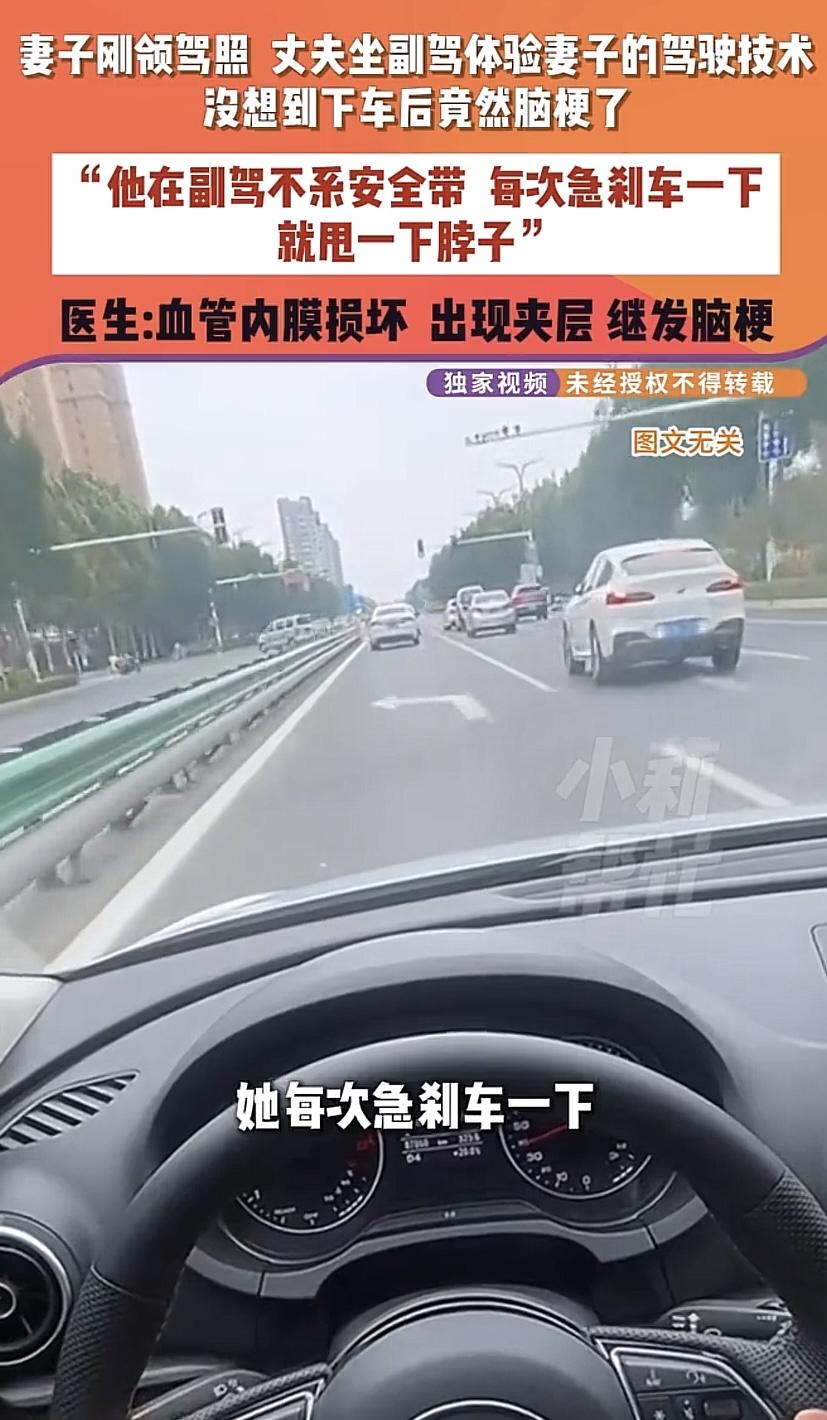 河南郑州,男子陪刚拿到驾照的妻子练车,他为了省事没系安全带,谁料,妻子在路上一脚一个急刹,男子的脖子不停甩出去再弹回来,等他下了车,只觉天旋地转,男子也没当回事,结果上班开会时,他突然发现自己说不出话了,意识到不对劲后,男子连忙来到医院,竟被查出脑梗。医生一番话让男子后悔不已。 男子这天开会,原本还侃侃而谈,谁料没过一会他再张嘴,竟突然说不出话了。 男子吓得赶紧去医院,这一查才发现,自己脑梗了,原因让他哭笑不得。 原来,他媳妇前阵子刚把驾照拿到手,正是手热想摸车的时候。 当老公的也挺配合,说走吧!陪你练两把!顺便看看你开车技术如何。 那天,两人找了个宽敞路段,媳妇握着方向盘,男子坐副驾。 大家都知道,坐副驾驶是必须系安全带的。 可男子心大,觉得自己就是个陪练的,媳妇练个车而已,车速也不快,系安全带勒得慌,他愣是没系。 车子开动了。媳妇毕竟是新手,一上路心里也是七上八下的,眼睛瞪得像铜铃,死死盯着前方的路。 男子坐在旁边,一开始还指指点点,说你看远点!别压线! 没开出多远,前面遇上个情况。媳妇一紧张,脚下猛地一踩刹车。 这脚刹车踩得又快又猛,车子“吱”一声瞬间停住。 因为没系安全带,男子的身体根本没固定,巨大的惯性让他整个人像个破布娃娃一样,猛地往前冲,脖子甩出去,紧接着又弹回来。 就这一下,男子觉得脖子有点不得劲,但他也没当回事,揉了揉说:慢点,慢点,你慌啥? 媳妇也不好意思,说知道了,下次我轻点踩! 可新手上路,哪有那么容易轻点?接下来的十几分钟里,类似的场景不断重演。只要媳妇一紧张,或者是误判了车距,就是一脚急刹。 男子就在副驾上,一次又一次地体验脑袋猛地前甩,再弹回来的感觉。每一次,脖子都要承受一次剧烈的扭曲。 终于熬到练车结束,两人下车。男子刚一下车,就觉得不对劲了。 头晕得厉害,天旋地转,脖子后面还隐隐作痛,恶心想吐。 他以为是刚才晃晕车了,想着回家缓缓睡一觉就好。 回到家,症状确实有所缓解,男子以为好了,哪成想后来会发生开头那一幕。 男子一看这架势,吓得魂飞魄散,赶紧通知妻子,两人前后脚到了医院。 到了医院,医生一检查,结果把夫妻俩都震住了:脑梗! 男子才30多岁,既没有高血压,也没有糖尿病,平时身体倍儿棒,怎么就脑梗了? 医生仔细问了病史,又听了妻子对练车时的场景描述,听完医生心里有数了,说你知道为啥脑梗吗?问题就出在急刹车和没系安全带上了。 医生解释道:这叫“颈动脉夹层”。男子坐副驾不系安全带,每次急刹车,头部剧烈甩动,脖子里的血管内膜被甩坏了、撕裂了。 血管壁一旦破损,血液就会钻进去,形成夹层,最后堵死血管,或者掉下来血块堵住脑血管,这不就脑梗了吗? 简单说,男子就是被媳妇的神操作给硬生生甩出了脑梗。 夫妻俩也没想到,陪个练能陪出这么大个问题。 所以说,上车不系安全带,神仙也难救。尤其是陪练的时候,副驾的刹车虽然不在你脚下,但风险一点不比主驾小。 《道路交通安全法》第51条规定:机动车行驶时,驾驶人、乘坐人员应当按规定使用安全带,摩托车驾驶人及乘坐人员应当按规定戴安全头盔。 丈夫作为副驾驶乘坐人员,未按规定系安全带是导致受伤的关键过错。 虽然他没有驾驶操作失误,但在车辆急刹时因未系安全带被甩动,致颈部血管损伤引发脑梗。 法律明确规定乘客也须系安全带,这不仅是为防碰撞,更是为防止急刹等突发情况下会发生的伤害。 对此,你怎么看? 关注@运良说法 学法律知识不迷路