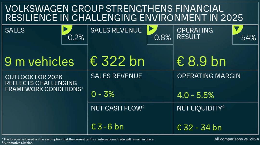 大众这次是真栽了个大跟头。 刚出的财报,2025年挣了多少钱?3219亿欧元,跟去年差不多。但利润呢?88.7亿,直接腰斩,跌了53.5%。 卖那么多车,钱去哪了? 大众自己掰着手指头数:美国关税啃掉一大块,保时捷转型花钱如流水,汇率在那捣乱,还有最要命的——在中国打价格战,打到手软。 尤其扎心的是电动车。大众去年在中国纯电车销量直接崩了44%,这边比亚迪、吉利们翻着倍往上涨,那边大众的新能源车却像被按了暂停键。年轻人试完车扭头就走,车机卡顿、智能拉胯,当年那套“德国工艺”的光环,不好使了。 于是大众急了。 先是砍人,核心品牌董事会席位一口气砍掉三分之一;再是省钱,五年投资砍了200亿;还要整合工厂,就为到2030年能抠出10亿成本。 可就在利润腰斩的当天,大众还拍着胸脯说,2026年要在中国搞“史上最大规模产品攻势”,扔出20多款新能源车。 这话听着豪气冲天,细品却有点孤注一掷的味道。以前是躺赢,现在中国品牌已经把智能座舱、高阶辅助驾驶卷成了标配,消费者早被惯坏了。你这时候再拿一堆慢半拍的车来填市场,人家真买账吗? 大众的2025年,就像个中年危机的成功人士——名片还响亮,身体却开始走下坡。裁人、省钱、推新车,全是药方,可药效如何,得看身体自己争不争气。 以前躺着赚钱的路,真走到头了。