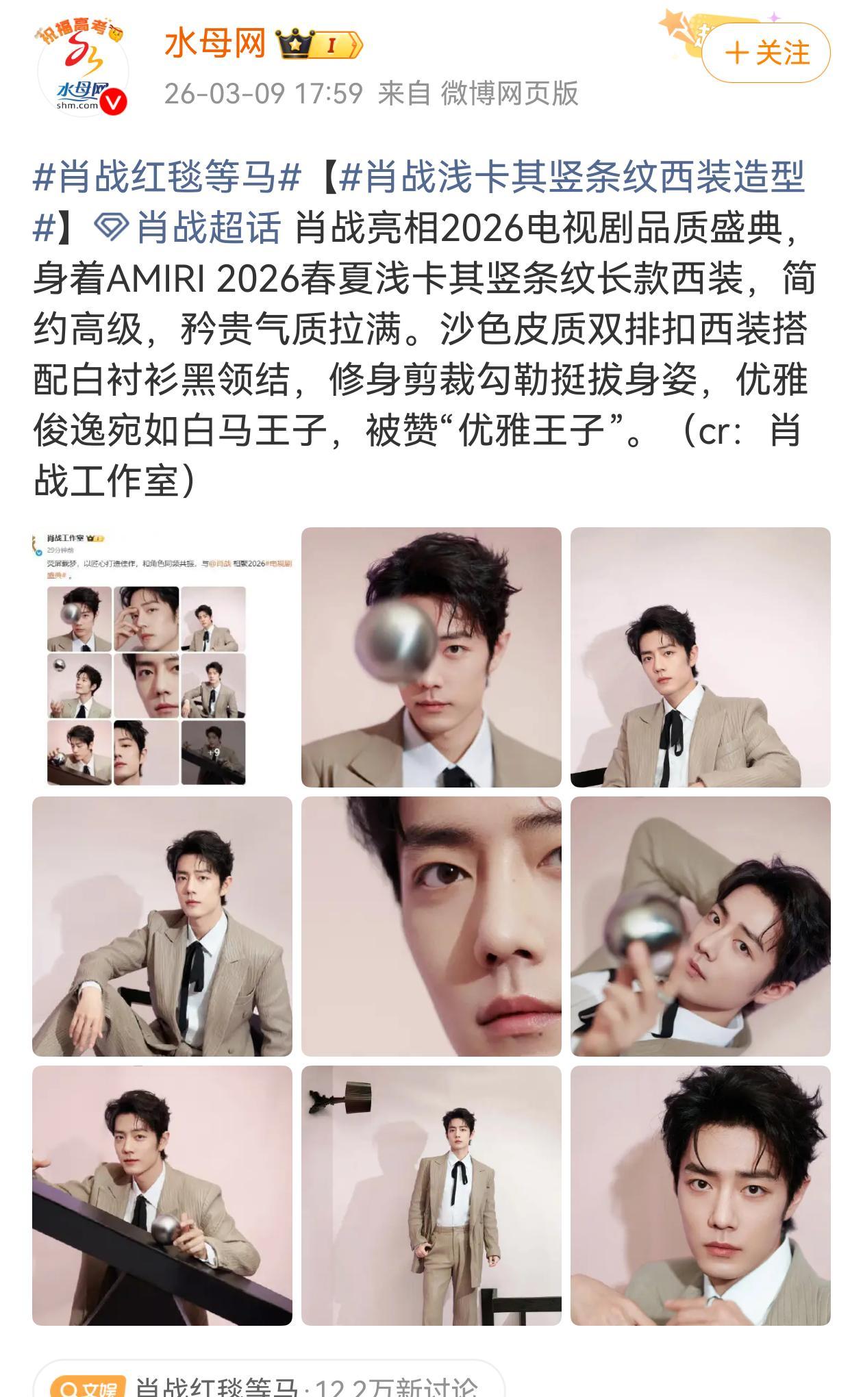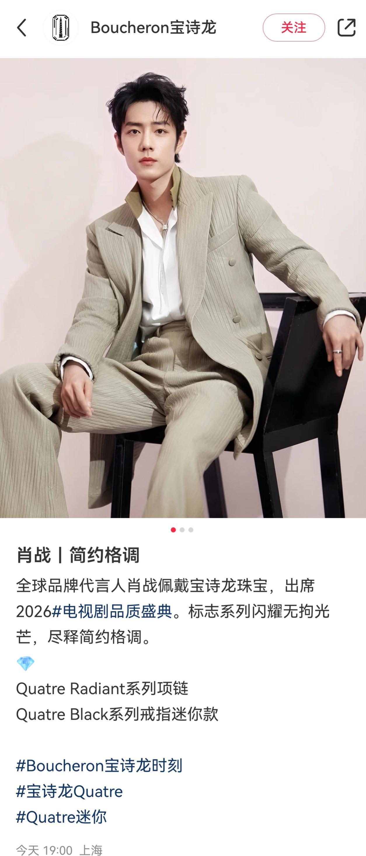 3月9日15点,上海的红毯准时开启直播。 肖战压轴现身时,身上那套浅卡其色竖条纹皮质西装,在春日的自然光里泛着温和的光泽。 这是2026年SMG电视剧品质盛典的现场。 他携2025年主演的古装剧《藏海传》而来,当晚从红毯走到内场,直至颁奖环节结束,镜头几次扫过,他始终坐在台下。 粉丝后来统计,他从18:30到23:30几乎全程在场,没有提前离席。 对一场被业内视作白玉兰前哨站的盛典来说,这种完整的参与本身,就是一种态度。 但当天最先被讨论的,是造型。 那套西装来自Amiri 2026春夏系列。 低饱和的柔棕调,带着竖条纹压纹工艺,材质是皮质面料。 不同于常见的黑色或深色礼服,这样的颜色在红毯上并不张扬,却很挑人。 它需要穿着者有足够的身形支撑,也要有气质去消化那份介于先锋与克制之间的表达。 时尚账号在第一时间标注了AMIRI 2026春夏系列,不少博主转发时,直接点出这是新季单品。 细看之下,西装内搭白衬衫,黑色蝴蝶结领带收束在领口,脚上是TOD’S皮质系带鞋。 没有繁复配饰,真正的点睛之笔在手上——Boucheron宝诗龙Quatre系列戒指。 镜头拉近时,戒指在袖口与手指之间闪过一抹冷光,线条干净利落。 肖战自2023年11月7日起成为Boucheron全球品牌代言人,Quatre系列是他多次公开演绎的主线。 这个诞生于2004年的系列,以建筑感线条和几何结构著称。 此次红毯虽然没有专门为他发布全新专属物料,但代言关系本身就是最直接的认领。 过往品牌官方多次发布他佩戴Quatre系列的图文内容,这次红毯造型也在相关时尚账号中被清晰标注。 一个有意思的对比是:Amiri并非他公开的品牌代言。 过去他在活动中多次选择Amiri单品,但双方并没有官宣合作。 这种选择本身,更多是一种审美契合。 先锋品牌的设计语言,与他近年来逐渐沉淀下来的状态,形成了某种呼应。 如果把时间往前推几年,会看到另一种画面。 1991年出生于重庆的肖战,毕业于湖北经济学院。2018年通过选秀节目进入公众视野,2019年凭借《陈情令》走红。 那时的他,更常被讨论的是流量与热度。 此后几年,他的重心逐步转向影视作品,从《余生,请多指教》到《玉骨遥》,再到2025年的《藏海传》,作品的体量与题材都在变化。 这次盛典上,《藏海传》获得年度品质榜样剧作等荣誉,他本人获颁年度卓越品质之星。 业内不少人把这个奖称为SMG视帝。 公开信息显示,他是该奖项最年轻的90后获得者。 红毯造型在这一刻有了另一层意义。 浅卡其色的皮质西装,不是锋芒毕露的黑,也不是刻意抢镜的亮色,更像一种过渡。 既保留年轻演员的锐度,又多了一份稳。 Quatre戒指的几何结构,在镜头里不张扬,却很难忽视——就像他近几年在影视领域的节奏,不急,但持续。 当天工作室曾在微博写道:和@肖战一起与《藏海传》共赴2026电视剧品质盛典,感恩每一次遇见与成长,期待与大家共赴品质之约。 这句话放在当晚的语境里,并不显得空泛。 毕竟,从红毯到内场,他用完整的在场时间回应了品质二字。 横向来看,当晚星光阵容包括孙俪、白敬亭、周深、白鹿等人,都是各自领域的代表人物。 纵向来看,肖战从选秀舞台走到如今的电视剧盛典领奖台,用了七八年时间。 奖项或许只是一个阶段性坐标,但对演员来说,每一次公开亮相,都是行业对你当下位置的判断。 品牌也在这样的判断中获得曝光。 Amiri的新季单品通过红毯画面被广泛传播,Boucheron的Quatre系列则继续巩固其在中国市场的代言人形象。 时尚与影视在这里交汇,不是简单的穿什么,而是一个演员在特定阶段的外在表达。 盛典完整版将于3月15日21:00在东方卫视播出。 到那时,更多观众会看到完整的舞台与发言。 但3月9日下午那一刻,浅卡其色的西装与戒指的光泽,已经定格成一个画面。 红毯会结束,直播会下线,奖杯也会被放进陈列柜。 真正留下来的,是一个演员在不同阶段的选择。 衣服会换,品牌会更新,作品却会一部一部叠加。 当灯光暗下,台下的人群散去,能陪他继续走下去的,或许从来不是某一场红毯的热搜,而是下一部作品开机时的那一声开始。
