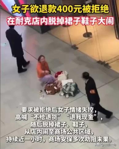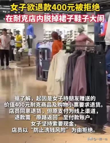 北京,女子的朋友,送了她400元的耐克商品,女子转头就拿去退货,店员同意了,但他们发现女子朋友是线上支付,退钱也是退到女子朋友的账户上,女子一听就不乐意了,坚持要他们退现金,店员拒绝了,女子一看店员拒绝,情绪失控,当场就脱裙子,脱鞋子,大吵大闹。 “这400元的东西是刚才买的,为什么不能退?”女子看到店员拒绝退现金,她质问店员,非得要店员退现金。 店员看着女子,感到无可奈何,他们已经答应女子,可以退款了,可是他们无法答应女子退现金。 就算是要退钱,那也是原路返回,钱只能退回到女子朋友的账户上。 发生这样的事情,店员看着眼前的女子,瞬间情绪失控,他们一时不知道如何是好。 其实女子拿的商品,就是她朋友买的,至于朋友出于什么原因送给她,店员不知道。 这本来跟退货也没有任何关系,东西确实是刚刚卖出去的,女子来退货,店员其实是可以不用退货的。 只要他们卖出去的东西,没有任何质量问题,那么店员可以不退钱。 只是这个女子一来就大吵大闹,说东西是刚刚买的,她就是要退货。 店员一看来者不善,东西确实是刚刚卖出去的,东西没有损坏,退钱也无伤大雅。 他们同意退钱,不过他们查了一下,女子的朋友在线上支付,既然女子朋友不是现金买东西,他们店有规定,顾客以什么样的方式买东西,退钱就需要原路返回。 这样一来,女子就拿不到那400块钱了,一旦这个钱退回给她朋友,朋友大概率不会把这400元给女子,女子也不好意思让朋友给这400块钱。 本来这400块钱的东西就是朋友送给她的,她把东西退了,其实就已经不讲什么情谊了,她拿到钱,钱才是她的,所以她来退东西,只要退现金。 女子的小算盘打得太响亮了,可现实就是现实,规矩就是规矩,店员得守他们店的规矩。 女子一看店员那么刻板,不愿意退现金,她瞬间情绪失控,在店内就开始大吵大闹,一会儿说退我现金,一会儿说不给我退钱。 看着女子大吵大闹,店员们都感到很无可奈何,遇到这样的女子,他们也是无言以对。 他们估计这个女子比较缺钱,朋友送的东西,也要着急着换钱,一点都不珍惜朋友的情谊。 他们看不惯女子的行为,更没有满足女子的行为,女子一看店员如此刻板,坚决不退现金,她从店内闹到商场的公共区域,并且还脱了裙子和鞋子。 眼前如此辣眼睛的场面,让人瞠目结舌! 女子如此不顾自己的形象,在公共场合大吵大闹,商场的保安都出动了,一直劝阻女子,可女子就是在那里大吵大闹。 看到女子这样,周围的人都热议纷纷了。 再怎么维权,女子也不应该脱了裙子,在大庭广众之下,撒泼打滚,以这样的形式威胁店家,丢脸的只有自己。 何况她要退的仅仅只是400元,钱并不多,没必要为了400元,如此控制不住自己的情绪,做出有失自己脸面的事情。 那么遇到这样的事情该怎么办呢? 首先,买东西的是女子的朋友,和店家构成合同关系的也是女子的朋友,就算店家要退货,原路返回没有问题。 《民法典》第509条规定:当事人应当按照约定全面履行自己的义务;当事人应当遵循诚信原则,根据合同的性质、目的和交易习惯履行通知、协助、保密等义务。 规则就是规则,如果消费者在线上支付,退钱都要现金退,这有风险。 其次,店员认为女子的行为涉嫌洗钱,他们不愿意退现金,他们做法合法合规。一旦这样的行为涉嫌洗钱,这确实是违法行为。 而且女子在公共场合大吵大闹,还脱裙子,这是扰乱公共秩序的行为,同样是违法的。 《治安管理处罚法》第23条规定:有扰乱公共秩序行为的,处警告或者二百元以下罚款;情节较重的,处五日以上十日以下拘留,可以并处五百元以下罚款。 作为一名女子,任何时候都不能失控自己的情绪,在大庭广上脱衣服,这真的让人难以入目。 那么你对女子的行为有何看法呢?