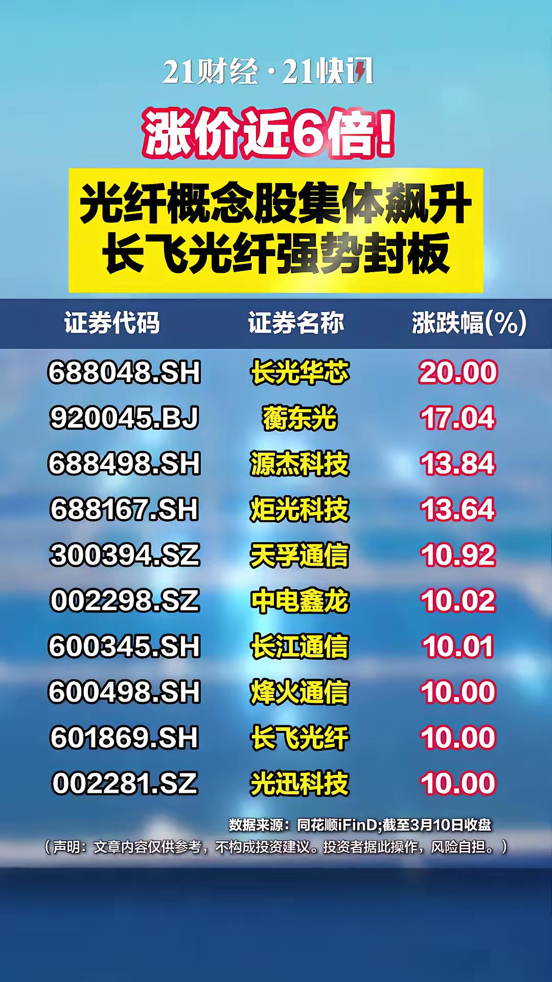 6G网要来了涨价近6倍!光纤概念股集体飙升,长飞光纤强势封板3月10日,从板块来看,光纤概念持续拉升,长光华芯20cm涨停,创历史新高;中电鑫龙、长江通信、烽火通信、长飞光纤、光迅科技涨停。