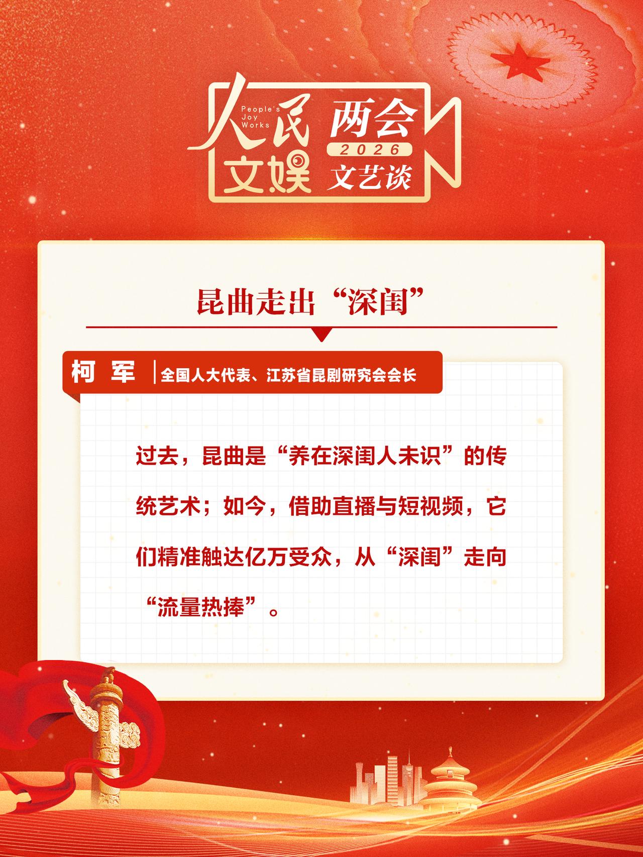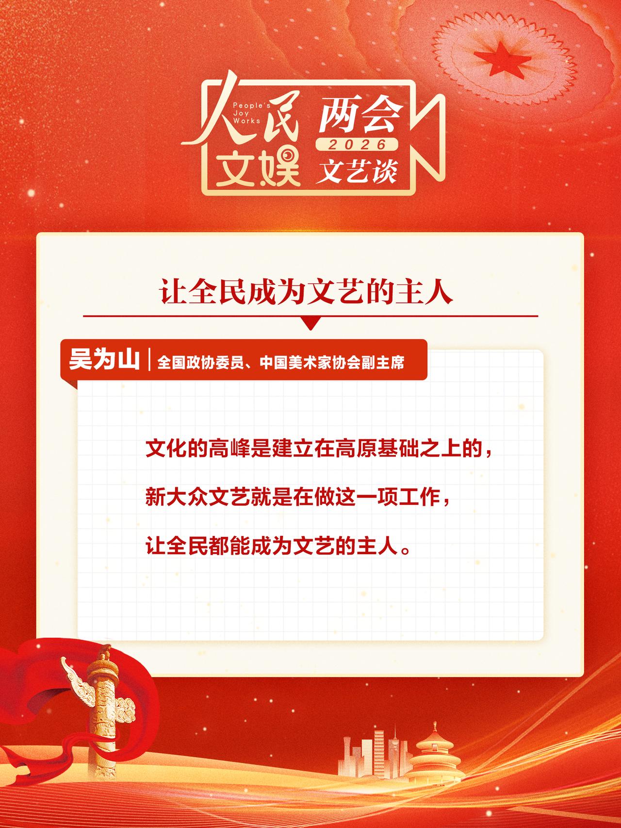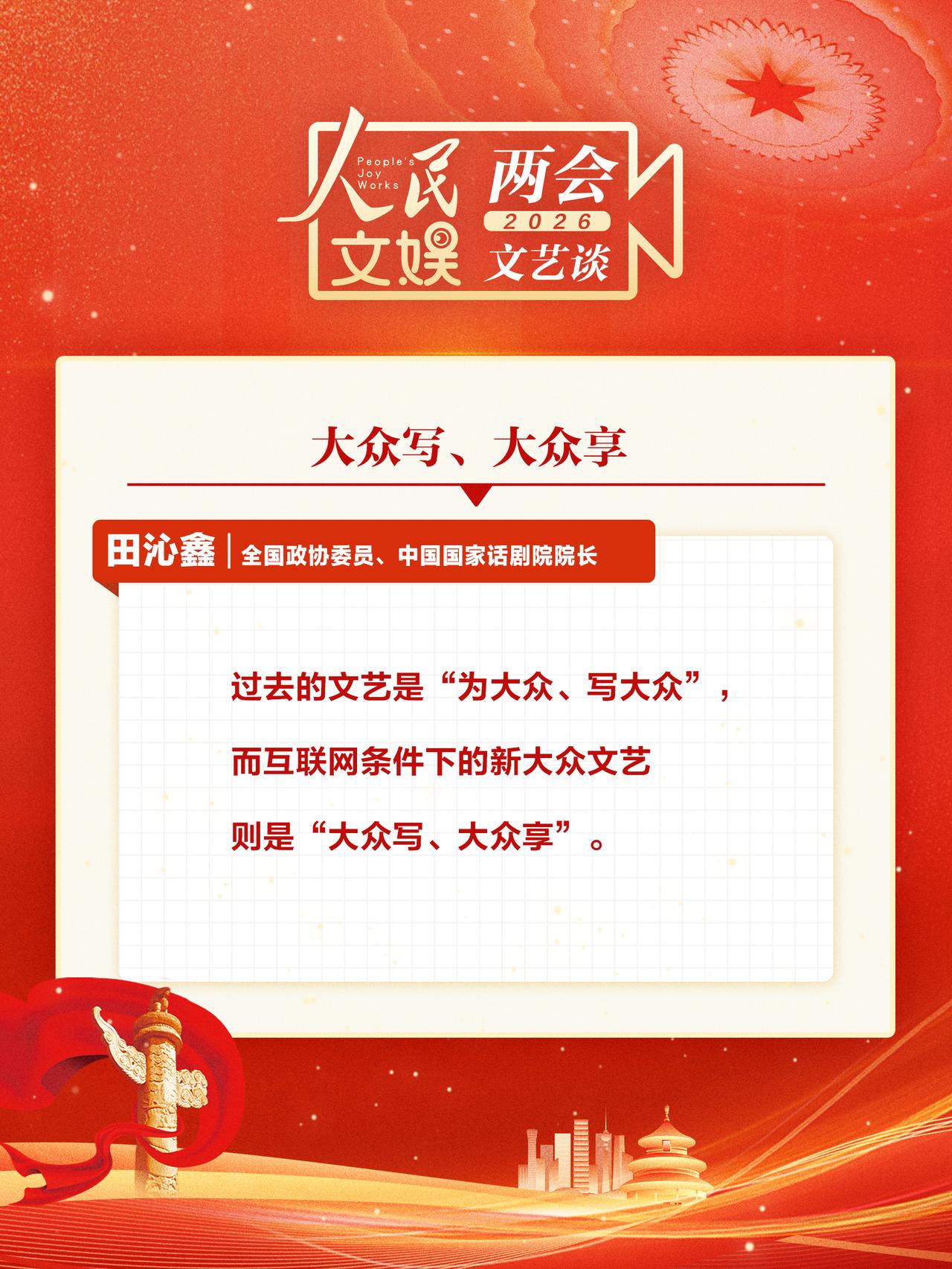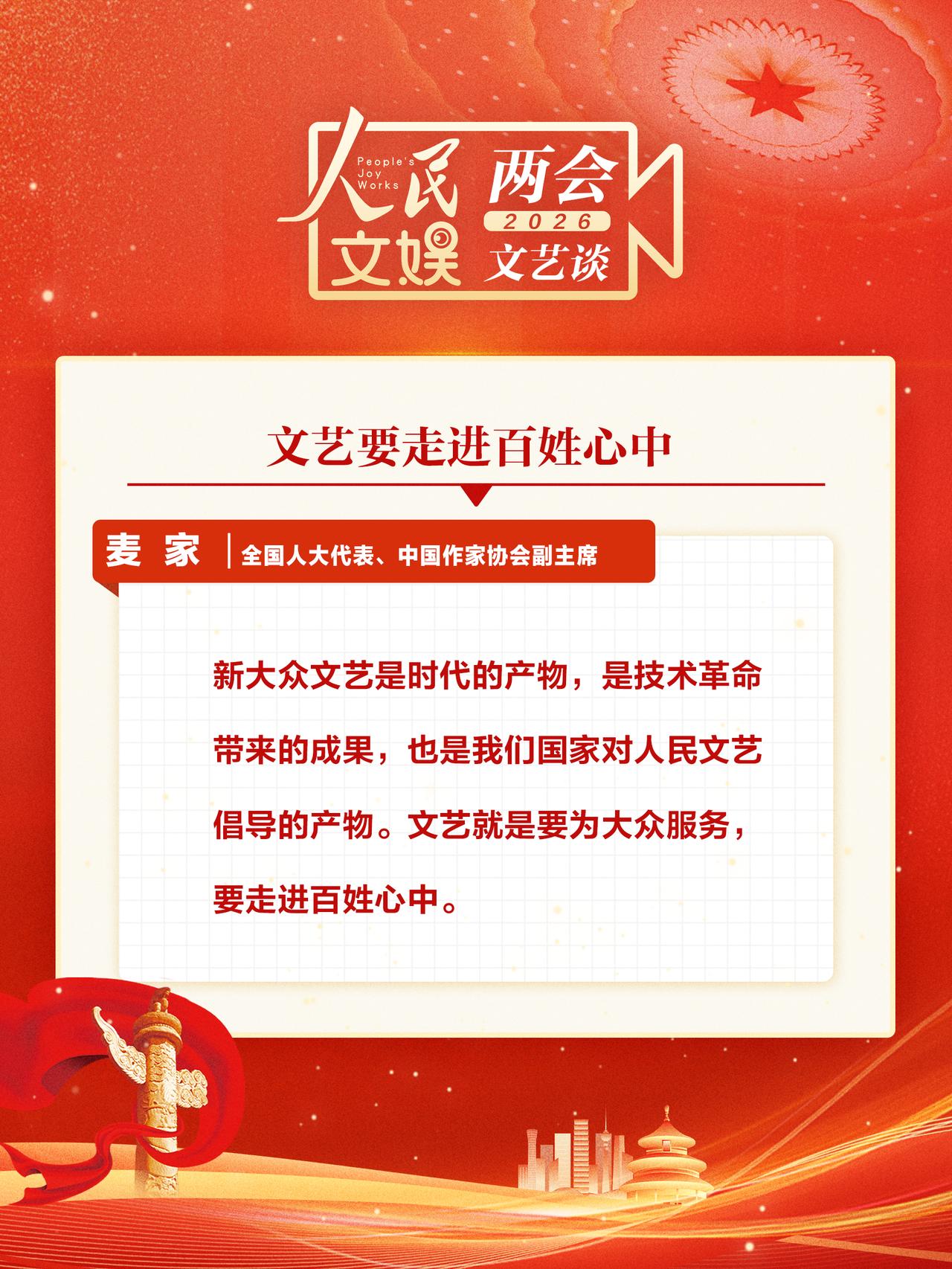 【两会代表委员谈新大众文艺 】 “新大众文艺”成为两会上代表委员热议的高频词汇。“繁荣互联网条件下新大众文艺”首次写入政府工作报告。吴为山、田沁鑫、蔡浙飞、麦家、柯军等人大代表、政协委员就新大众文艺发表观点。人民文娱两会文艺谈 新大众文艺的繁荣,是亿万人民共同书写的时代华章。