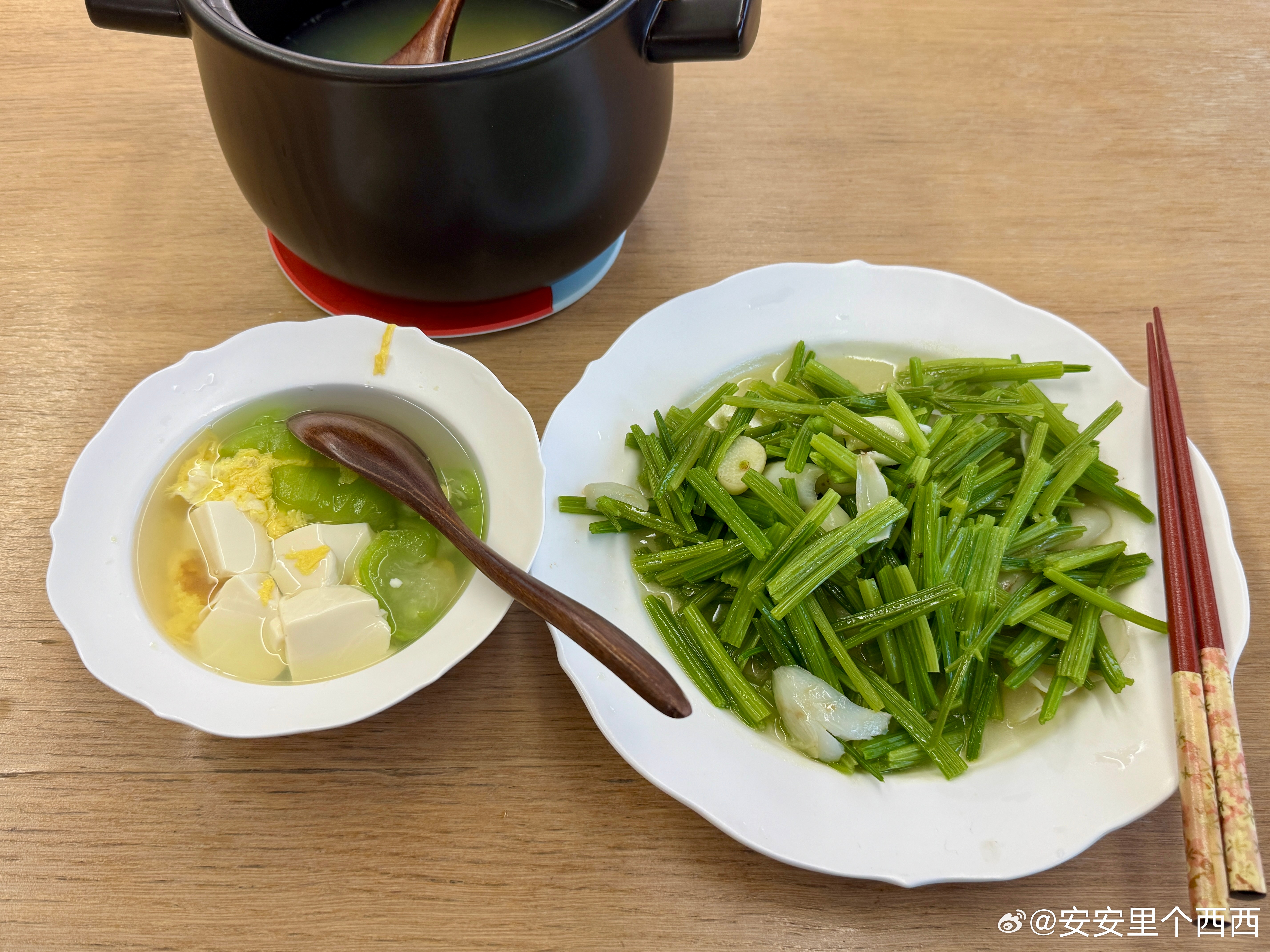 吃的时候我在想这,我的脂肪得连夜开个会了吧丝瓜汤是一点油都没有芹菜百合我只放了一丢丢橄榄油