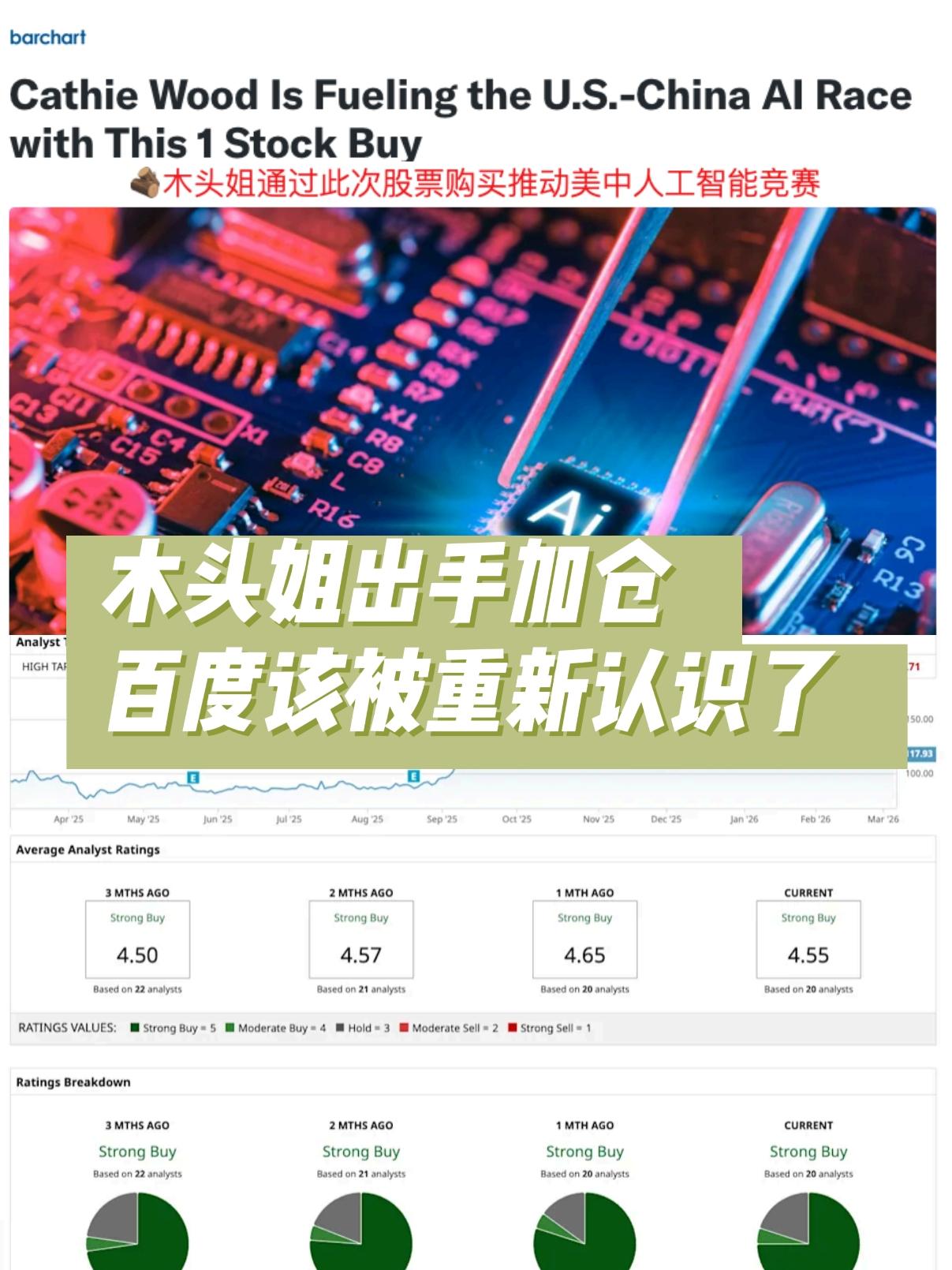 百度被低估?木头姐加仓的背后,估值逻辑该变了 当下的资本市场,正陷入对百度估值的认知偏差——用看传统互联网企业的老眼光,去衡量一家已然扎根AI赛道的科技公司,结果自然是其真实价值被严重低估。虎嗅近期的文章一语中的,AI时代的企业估值,核心看未来成长潜力,而非纠结当期利润,这一点,在百度身上体现得尤为明显。 如今的百度,早已不是停留在传统业务的互联网企业,其AI业务的崛起速度,正在不断刷新市场认知。2025年百度AI业务交出400亿营收的成绩单,更值得关注的是其营收占比的快速攀升,短短一个季度,占比就从39%提升至43%,近5个百分点的增长,印证了AI业务已然成为百度发展的核心引擎。按照这样的发展态势,核心AI业务营收占比将持续走高,未来三年内有望突破七成,成为绝对的营收支柱。这组数据背后,是百度AI业务从布局到落地的全面开花,更是其向AI平台型企业转型的硬核佐证。 百度的AI布局,早已形成多线并进、协同增长的格局。智能云业务作为AI落地的重要载体,保持着高速增长态势,在大模型相关的市场竞争中,凭借扎实的技术和落地能力,连续两年在招投标中拿下项目数和金额双料第一,成为行业内的标杆。C端AI应用同样成绩亮眼,全年营收突破百亿,秒哒赋能全球用户打造超百万款应用,文心助手以3.6亿月活坐稳行业第一,成为大众AI应用的标杆产品。而AI原生营销服务的表现更是惊喜,2025年营收同比暴涨301%,成为百度新的业绩增长爆点。 除了已经兑现业绩的AI业务,百度手中还有两大尚未被充分定价的王牌。自动驾驶领域的萝卜快跑,已经实现了规模化落地,在26座城市开展服务,全球单量突破2000万,还将单程成本控制在较低水平,对比海外仍处于测试阶段却享有超高估值的同行,萝卜快跑的成长潜力和商业价值被严重低估。芯片领域的昆仑芯,目前已步入IPO阶段,专业机构给出了500亿美元的估值,成为重要的价值洼地。 市场的敏锐资金早已嗅到百度被低估背后的机会,素有女版“巴菲特”之称的木头姐,近期大手笔增持超1200万美元的百度股票,这一动作不仅是对百度AI布局的高度认可,更像是给市场提了个醒:百度的AI价值,不该再被忽视。 当下资本市场仍在用传统的估值框架审视百度,却忽略了其“芯-云-模-体”全栈AI布局已经形成的协同效应。百度如今已是手握多条增长曲线的AI平台型企业,其在智能云、自动驾驶、AI原生应用生态等领域的增长潜力和独立价值,远未在当前市值中得到充分体现。对于百度,市场需要摒弃旧有思维,用分部估值的新逻辑重新审视,才能真正看见其背后的真实价值。 百度 百度AI 长期主义 百度长期主义全栈 百度股价 昆仑芯