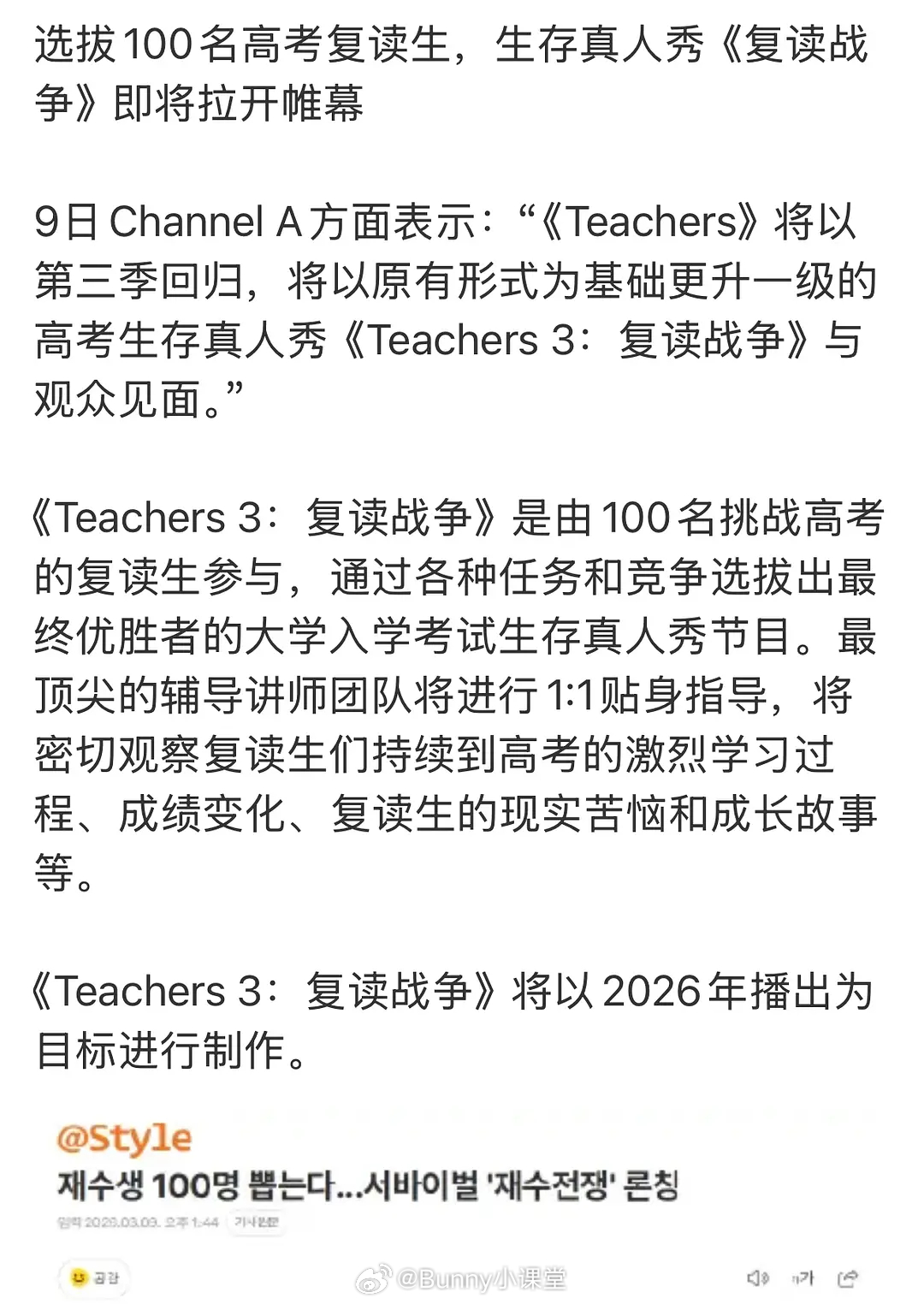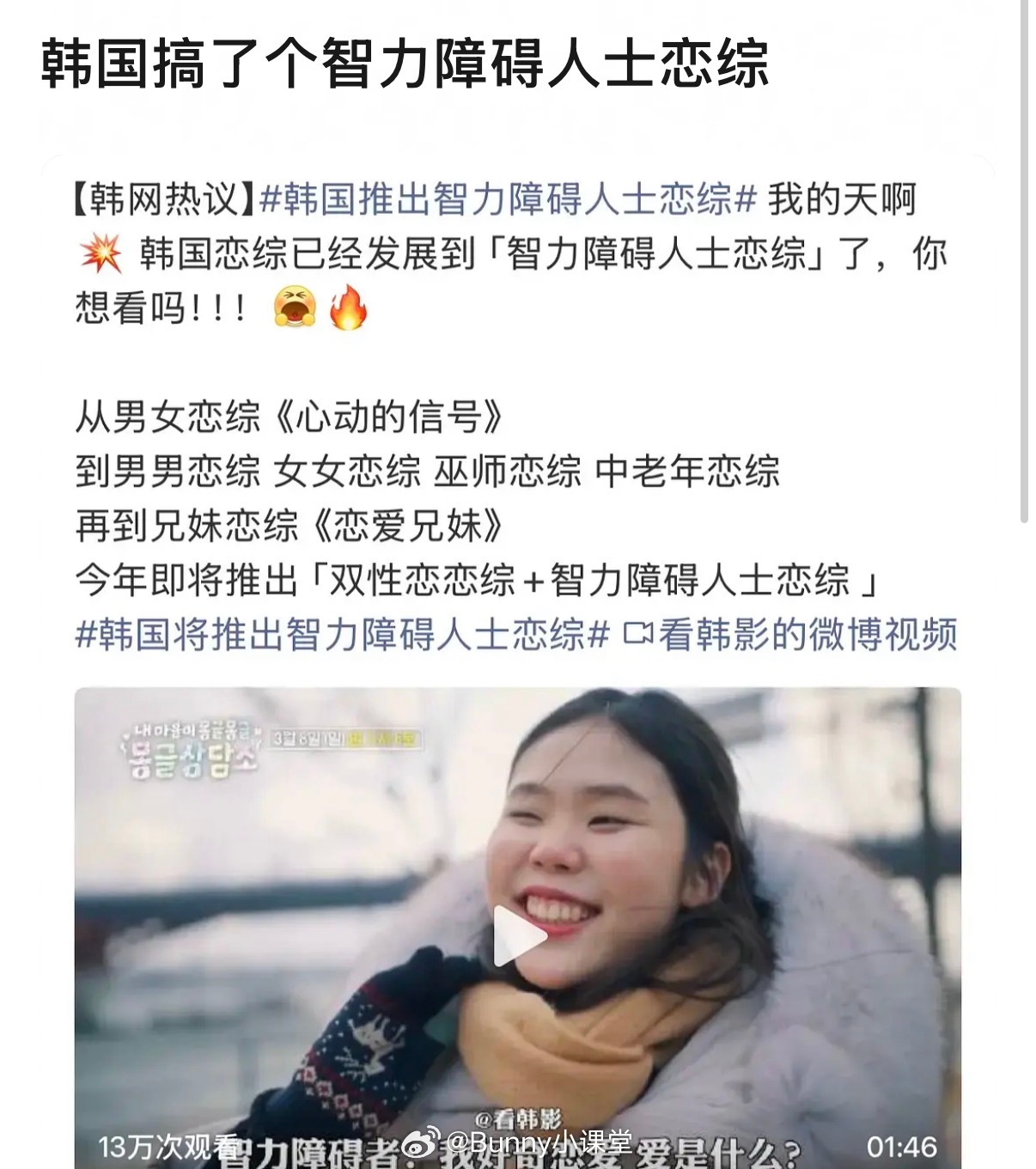 你们韩国综艺精神状态太超前了,最近出了个智力障碍人士恋综,又出了个高考复读101,真的有人看吗