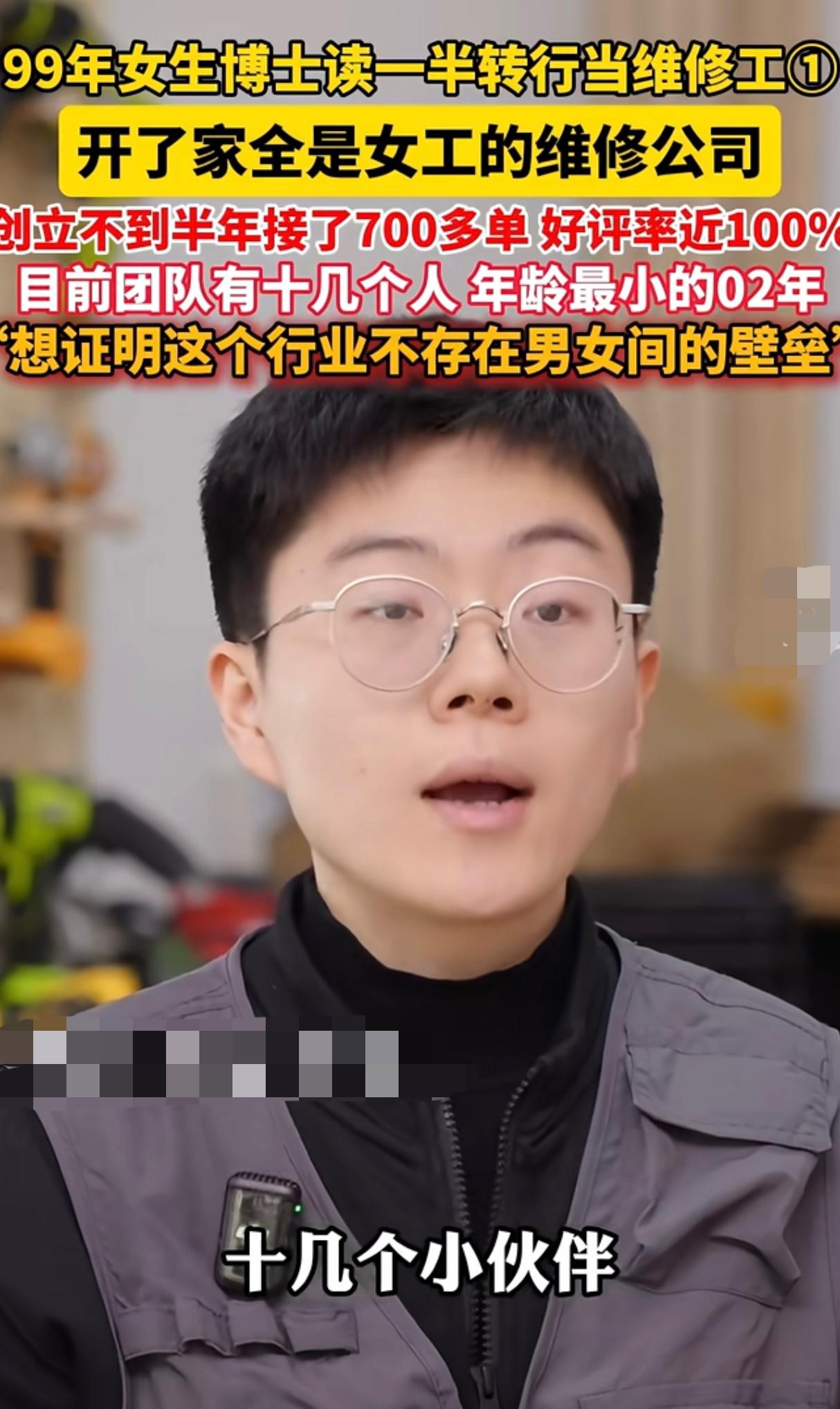高学历(博士)+性别专业(女性领导力)+全女团队(女维修工)+反对男性垄断的态度,女性觉醒的剧本都不敢这么写,唯一的漏洞是选错了行业,浙江的这位女博士可能没搞清楚,家电维修这种行业本就和男性主导没什么关系,女性从业者少是因为工作性质对体力有要求收入也一般。半年700单生意,即使平均1单200的利润,10多个人平均工资才不到3000,能生存下来也很厉害。