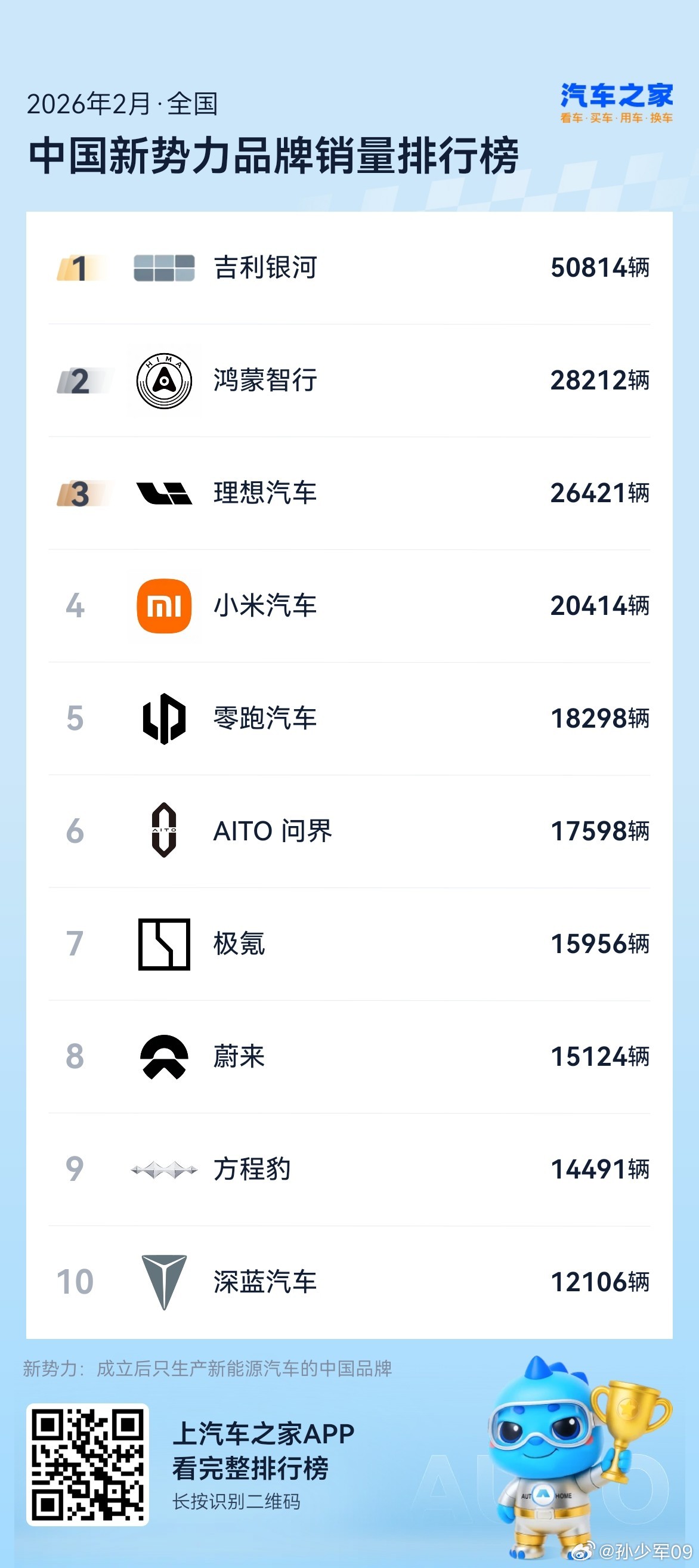 2月新势力销量排行榜,吉利银河 第一,鸿蒙第二,理想第三,小米第四