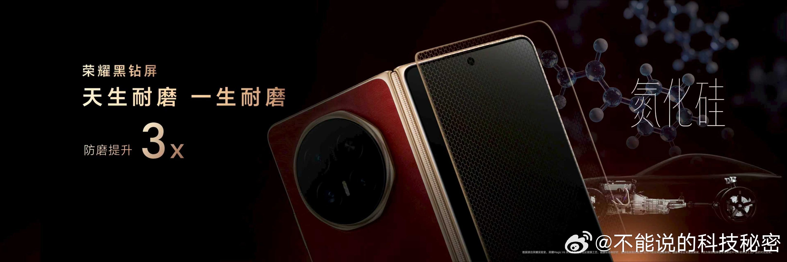荣耀Magic V6 在内外双屏上均配备至臻黑钻屏,将跑车轴承同款的高性能材料“氮化硅”引入手机屏幕,凭借5600层氮化硅镀膜和芯片级高精工艺,防磨性能提升3倍。同时,凭借最新的抗反科技,将屏幕反射率降低至1.5%,打破“低反、耐磨、抗刮”不可能三角,裸机状态使用36个月依然光亮如新,以最强折叠屏幕表现,与屏幕焦虑说拜拜。