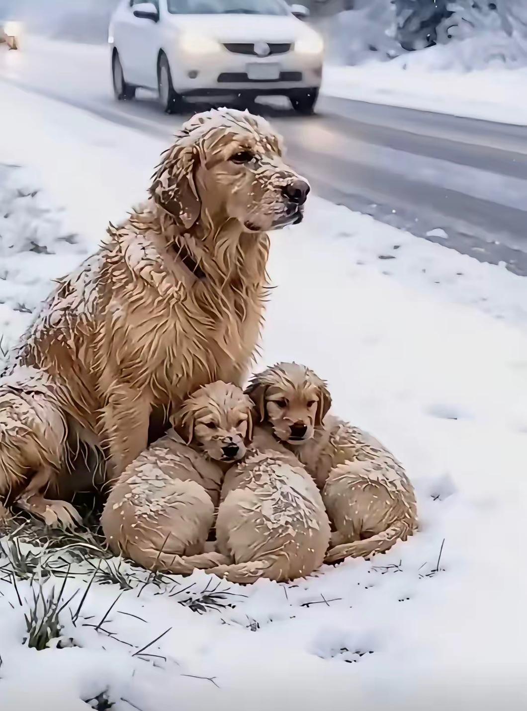 年前回老家,下雪又冷在路边看到只金毛妈妈把三只小狗紧紧护在怀里。它的毛都冻成了冰条,却还是把孩子们往自己暖乎乎的肚子底下塞,眼睛盯着过往的车,盼着有人能停下来,给它们一口吃的。 当时老家的室外气温跌至零下六度,柏油路面结着薄冰,北风裹着雪粒刮在脸上生疼,我裹着加绒羽绒服都觉得寒气钻骨,更别说露天待着的这窝狗狗。我减速后才看清护栏旁的场景,心里瞬间被揪紧,金毛妈妈的长毛被雪水浸透后冻成硬邦邦的冰棱,四肢贴在冰地上不停微微颤抖,却始终弓着腰用身体挡死寒风,三只刚出生的奶狗被严严实实捂在腹下,连一丝绒毛都没露在外面。 路上的车辆大多疾驰而过,紧闭的车窗让没人留意这团蜷缩的毛球,金毛妈妈就一直抬着冻僵的头,目光死死追着每一辆驶过的车,眼睛里混着怯意与执着,偶尔发出细弱的呜咽,像是在求助,又像是低头安抚怀里扭动的幼崽。我赶紧把车停在安全区域,翻出车里备用的幼犬粮、温水,还有出门时随手塞的旧珊瑚绒毯,慢慢朝它们靠近。 金毛妈妈瞬间绷紧身体呲牙,浑身冰毛都竖起来,用整个身躯挡在小狗跟前,满是戒备。我没再上前,只把泡软的狗粮和温水放在两步外的地方,静静站在原地,它盯着食物看了许久,紧绷的脊背慢慢放松,却始终不肯挪开护崽的姿势,只是低头用鼻尖蹭了蹭小狗,确认孩子安稳后,才试探着凑到食碗旁。 它进食时全程半蹲,保持着能随时护住孩子的姿态,小口吞咽狗粮,喝水都不敢低头太久,时不时抬眼瞥向腹下,生怕寒风钻进去。明明已经饿了许久,它却把孩子的安全放在第一位,连填饱肚子都不敢彻底放松,这份本能的守护,看得人鼻尖直发酸。 我把旧毯子铺在它们身下挡住风口,立刻联系了当地流浪动物救助站。大雪天里,未满月的奶狗没有保温和食物,基本撑不过一夜,金毛妈妈就算拼尽所有,也没法带着孩子熬过寒冬。等待救助的半小时里,金毛妈妈彻底放下戒备,用冰凉的头轻轻蹭我的手背,眼里的怯意全都变成了温顺的依赖。 救助站工作人员赶到后检查发现,小狗出生还不到一周,金毛妈妈四肢有轻微冻伤,再晚发现几小时,母子几个都很难存活。工作人员将它们抱进保温箱时,金毛妈妈乖乖配合,目光却一直黏着装幼崽的箱子,半步都不肯移开。 很多人觉得动物情感简单浅薄,可这只流浪金毛妈妈,用最朴素的行动展现了最纯粹的母性。它自身深陷严寒与饥饿,却从未想过放弃孩子,拼尽全力为幼崽撑起温暖的小空间。寒冬风雪虽冷,人间点滴善意却能托起弱小的生命,母性的光辉从不分物种,每一份拼尽全力的守护,都值得我们心生动容。 各位读者你们怎么看?欢迎在评论区讨论。