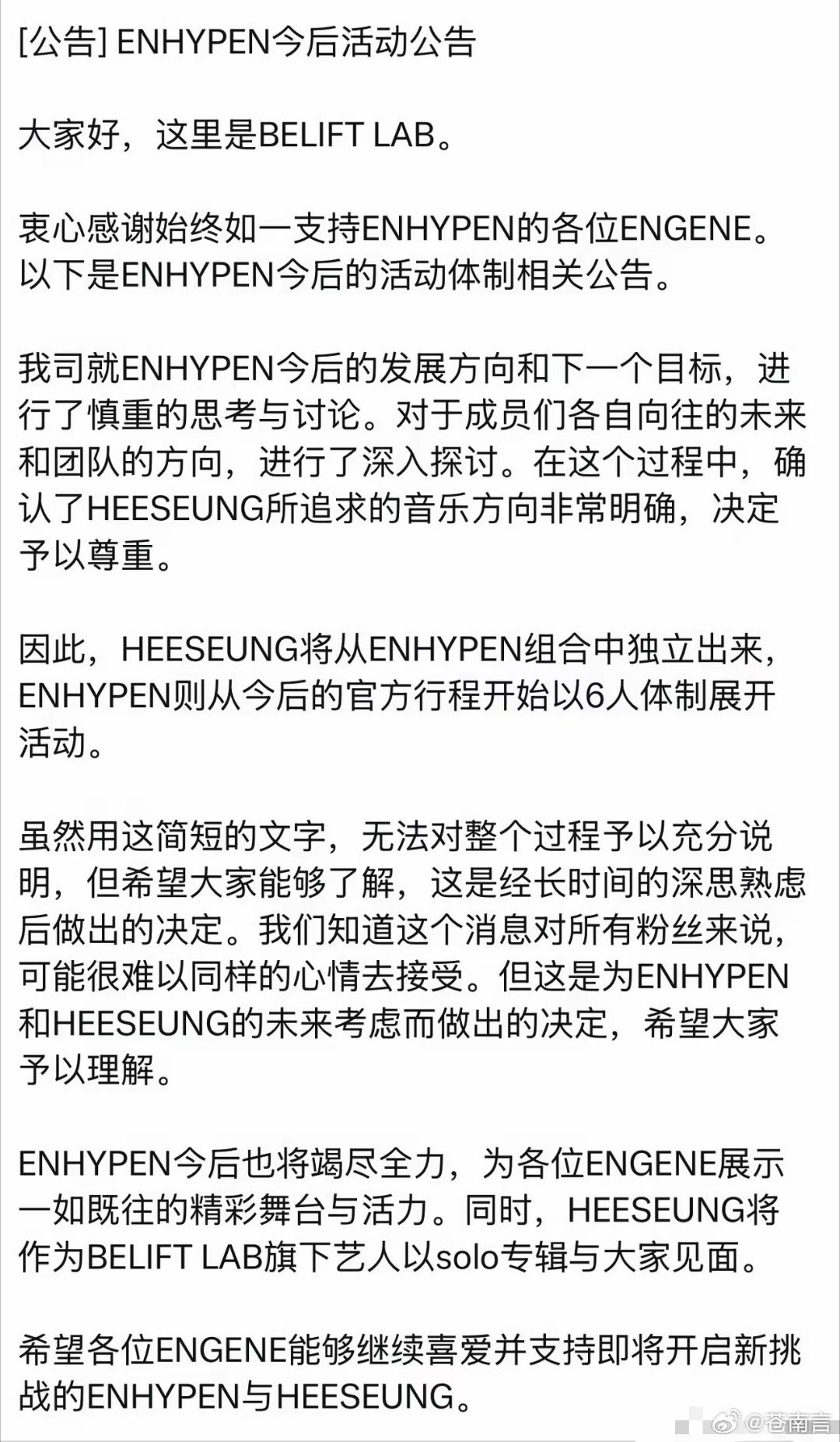 李羲承退队突发!ENHYPEN李羲承退队,组合将以6人活动3月10日,韩国男团ENHYPEN官方公告,成员李羲承正式退队,未来组合以6人体制活动。公司称因个人音乐方向与团队规划不同,经长期商议后决定,李羲承将转型solo歌手发展。消息一出瞬间刷屏,粉丝感慨不已,一代顶配阵容就此落幕。
