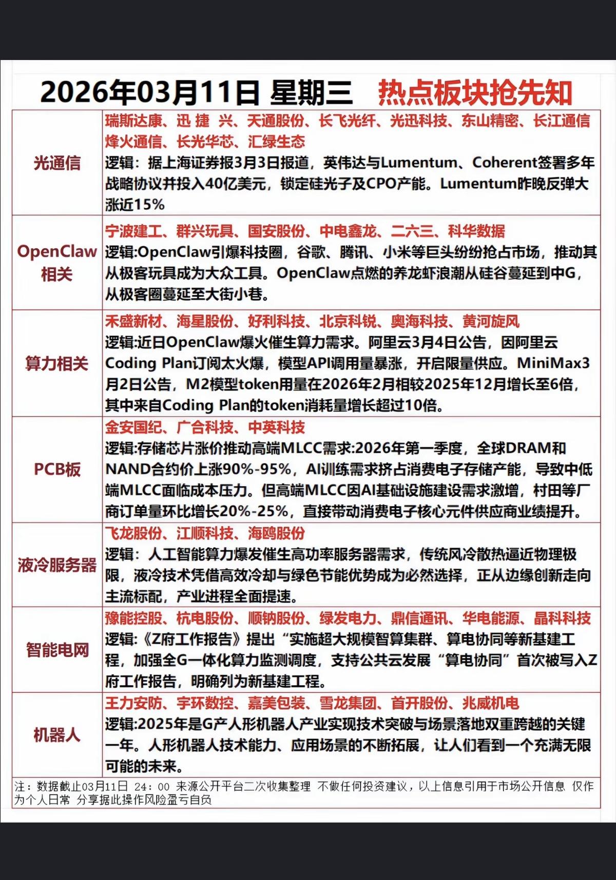 3.11周三 市场热点方向+投资逻辑! 1.光通信 2.OpenClaw 3.算力租赁 4.PCB板 5.液冷服务器 6.智能电网