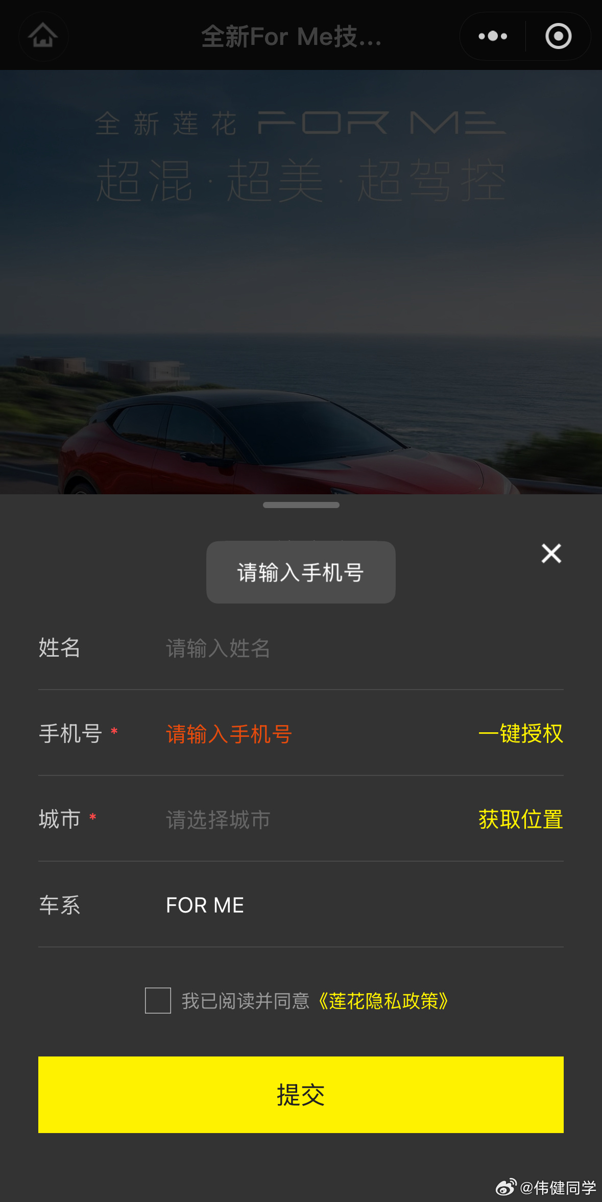 最后说一点我的感受,我个人有点反感需要填手机号码才能进一步了解车型信息这一步骤。就例如图一下方的二维码,我只是想进去了解下ForMe车型有几种外饰/内饰颜色搭配,这时就需要我填手机电话一我没有购车需求二我不想后续被电话打扰,所以普通用户想了解个车型信息真的难。