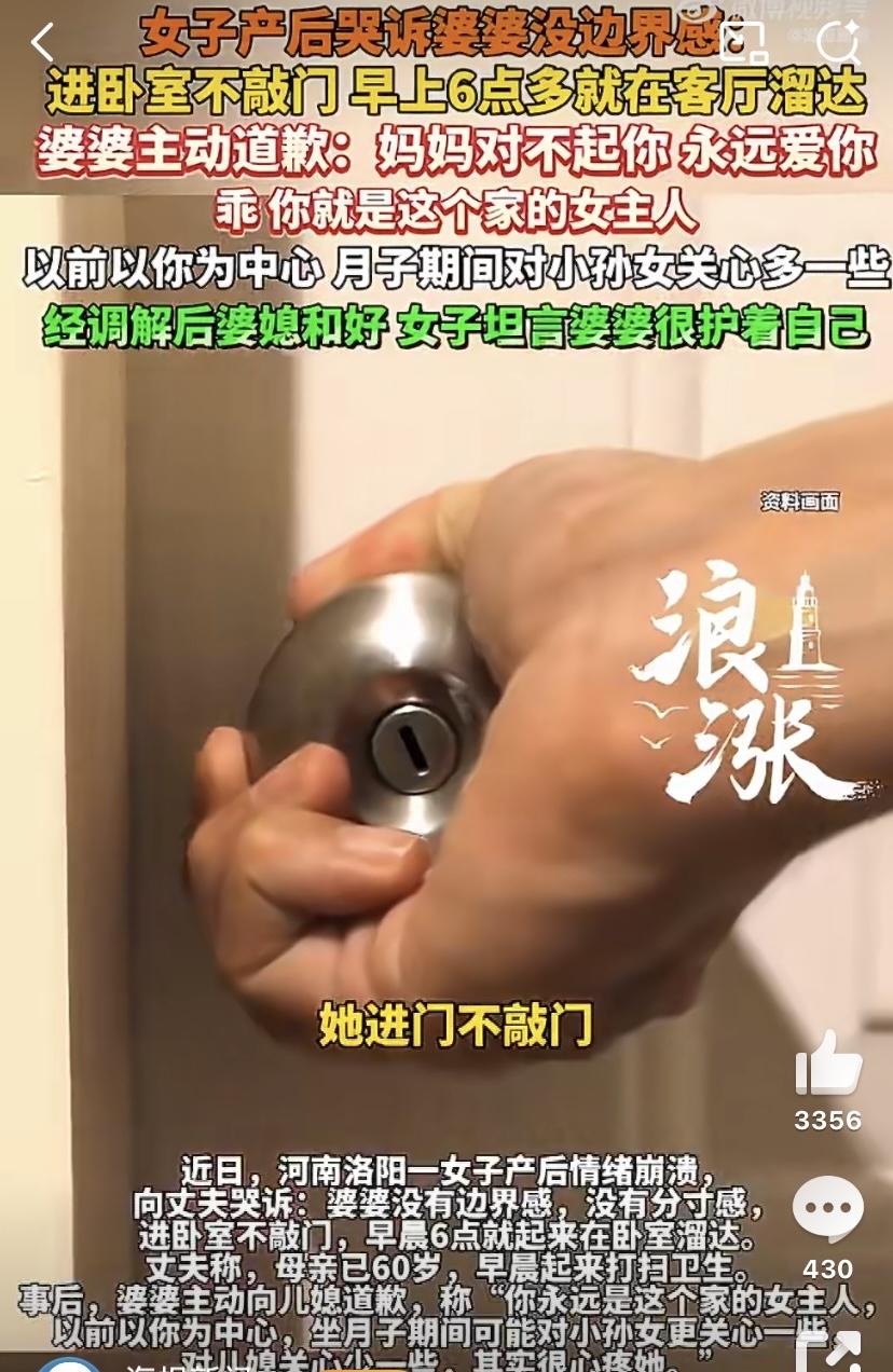 一位刚生完宝宝的儿媳对着丈夫崩溃大哭,控诉婆婆进卧室从不敲门,甚至早上六点多就直接走进卧室溜达。丈夫解释说,婆婆六十岁了,早起是想帮忙打扫卫生,一片好心,可在儿媳眼里,这份不分时间、不打招呼的“关心”,早变成了压垮情绪的稻草。产后本就身体虚弱、心思敏感的她,连睡个安稳觉、喂个奶、和丈夫说句悄悄话都要提心吊胆,生怕卧室门突然被推开,那种无处躲藏的委屈,让她彻底绷不住了。 说真的,看到这儿我特别能共情这位儿媳。谁结婚后不是盼着有个能放松的小天地?卧室就是我们在这个家里最后的私密角落,换身舒服的衣服、放空发呆、处理自己的情绪,都需要这份安全感。可婆婆不敲门就进来,哪怕是送杯水、收拾下东西,那种被窥探、被打扰的感觉,真的能让人瞬间火大,更别说产后本身就容易情绪敏感,一点点刺激都能放大委屈。更让人无奈的是,不少人还会说“老人好心帮你,别矫情”,可他们不懂,尊重从来不是看对方做了什么,而是看对方舒不舒服。 更气人的还有老公的态度,很多时候老公只会和稀泥,说“妈年纪大了,习惯了,你多担待”。可他忘了,妻子才是要和他过一辈子的人,她的委屈不是“小事”,是需要被看见、被重视的。婆婆那边呢,也不是坏心眼,就是老一辈习惯了“一家人不分你我”,觉得进儿子儿媳房间不算啥,可他们没意识到,时代变了,小家庭的边界感得跟上。直到婆婆听说儿媳的委屈,主动道歉说“你永远是这个家的女主人,是妈妈忽略了你的感受”,这场风波才慢慢平息,儿媳也坦言婆婆其实很护着自己。 其实这事儿根本不是“谁对谁错”,而是“边界感”的问题。爱可以无私,但相处必须有分寸。进门敲个门,不过是举手之劳,传递的却是“我尊重你的空间,我在乎你的感受”。很多家庭矛盾,都是毁在这种“以爱为名”的越界上,打着“为你好”的旗号,做着让人不舒服的事,最后反而伤了感情。 丈夫作为中间的关键人,真的不能只和稀泥,得主动站出来沟通,既要理解妻子的隐私需求,也要委婉跟妈妈说清楚小家庭的相处规则,别让一方受委屈。而婆婆们也该明白,儿子成家了,就是独立的小家庭,保持一点距离,不随意插手、不贸然闯入,才是对晚辈最好的支持。 家是讲爱的地方,但更需要懂分寸。你们家有没有类似的边界问题?都是怎么解决的?不妨聊聊,说不定能帮更多家庭少点矛盾,把日子过成暖心的模样。婆婆进卧室不敲门儿媳崩溃哭诉 来源:海报新闻