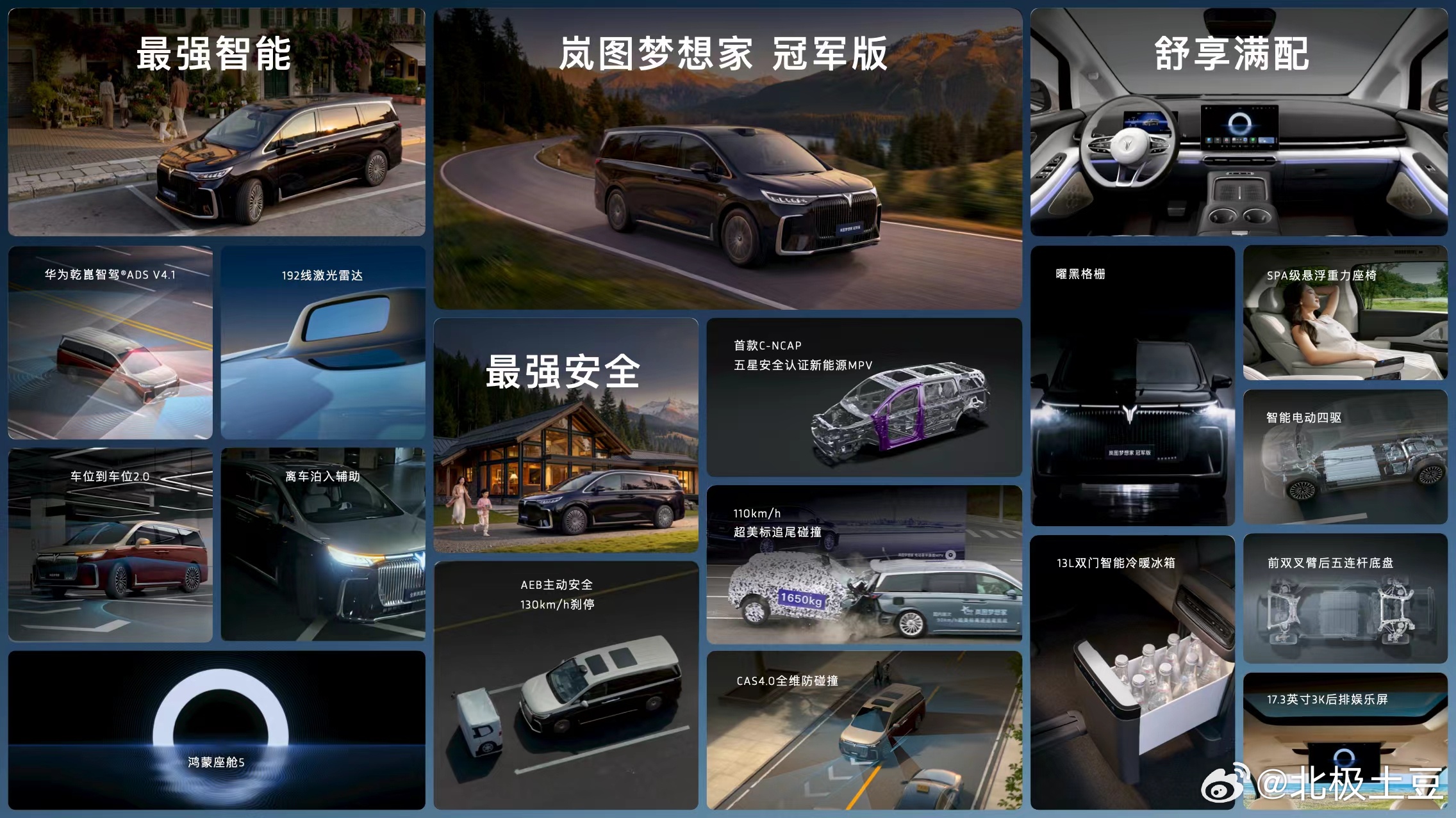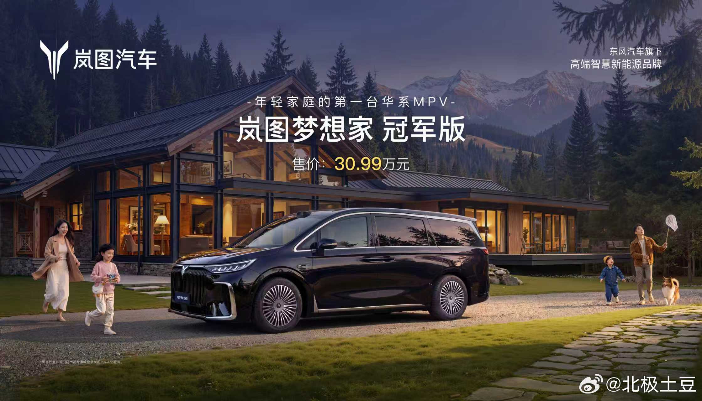 同日,岚图梦想家冠军版限量上市,售价 30.99 万元。新车定位豪华七座智能家用 MPV,采用全新曜黑格栅设计,气场更强;搭载同级唯一华为乾崑智驾 ADS4,搭配鸿蒙座舱与百万级底盘架构,兼顾智能与舒适。同时凭借超美标碰撞测试、高强度车身与全面主被动安全,打造 30 万级 MPV 安全标杆,以全能实力满足家庭用户多场景出行需求。