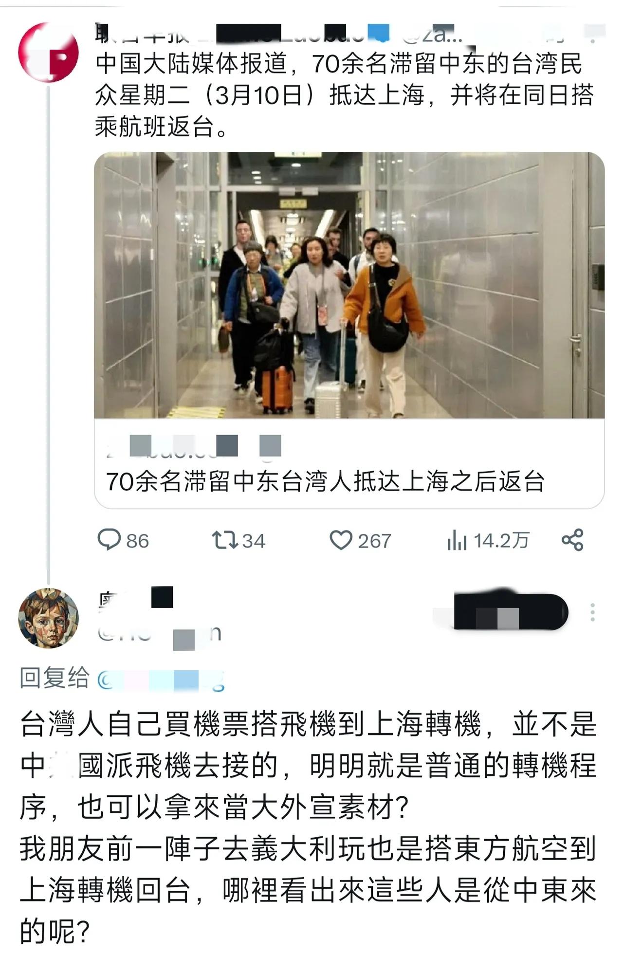 大陆帮助滞留中东的74台湾省人返台,却遭冷嘲热讽! 对于大陆帮忙协助74名滞留中