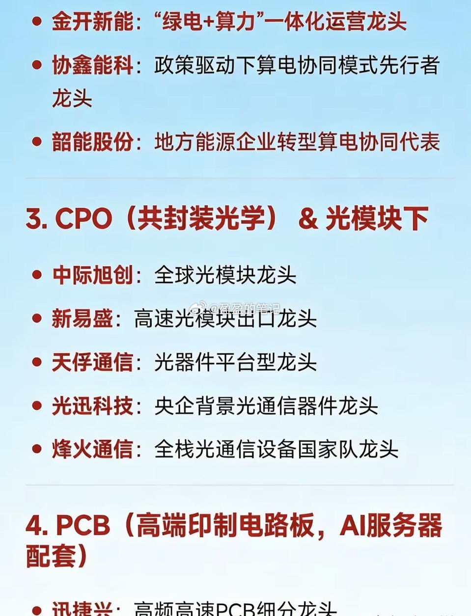 2026年3月10日十大热门科技及其产业链核心龙头1. 算力租赁 / AI算力基础设施拓维信息:国产AI算力租赁领军企业美利云:西部算力枢纽与国资云龙头企业云赛智联:上海政务算力与智算中心运营领军者华胜天成:华为昇腾生态智算中心建设龙头2. 算电协同(绿电+算力融合)金开新能:“绿电+算力”一体化运营龙头企业协鑫能科:政策驱动下算电协同模式先行龙头韶能股份:地方能源企业转型算电协同典型代表3. CPO(共封装光学) & 光模块中际旭创:全球光模块领军企业新易盛:高速光模块出口龙头企业天孚通信:光器件平台型龙头企业光迅科技:央企背景光通信器件领军者烽火通信:全栈光通信设备国家队龙头4. PCB(高端印制电路板,AI服务器配套)迅捷兴:高频高速PCB细分领域龙头广合科技:AI服务器PCB核心供应商龙头金安国纪:覆铜板 - PCB一体化龙头企业联瑞新材:PCB上游硅微粉材料龙头企业5. 商业航天航天电器:航天电子元器件龙头企业中衡设计:商业发射场基建设计龙头企业中国西电:航天配套电力装备龙头企业6. 创新药 / 生物医药(新兴支柱产业)信立泰:心血管创新药龙头企业百利天恒:双抗/ADC平台型创新药领军者荣昌生物:自免与肿瘤生物药龙头企业海思科:中枢神经创新药龙头企业7. 信创(信息技术应用创新)中国长城:国产CPU+整机信创国家队龙头企业汉得信息:企业级信创解决方案龙头企业优刻得 - W:国产云计算与信创云服务龙头企业8. 数据中心 / AIDC(人工智能数据中心)顺网科技:边缘算力与网吧云转型AIDC龙头企业青云科技 - U:混合云与AIDC基础设施服务商龙头网宿科技:边缘计算与绿色数据中心龙头企业9. 超硬材料 / 培育钻石黄河旋风:培育钻石+超硬材料全产业链龙头企业力量钻石:HPHT法培育钻石产能龙头企业四方达:CVD金刚石功能材料技术龙头企业10. 新能源(锂电 + 绿电)宁德时代:全球动力电池与储能系统龙头企业晶科科技:光伏电站运营+绿电交易龙头企业华电能源:火电转型绿电区域龙头企业