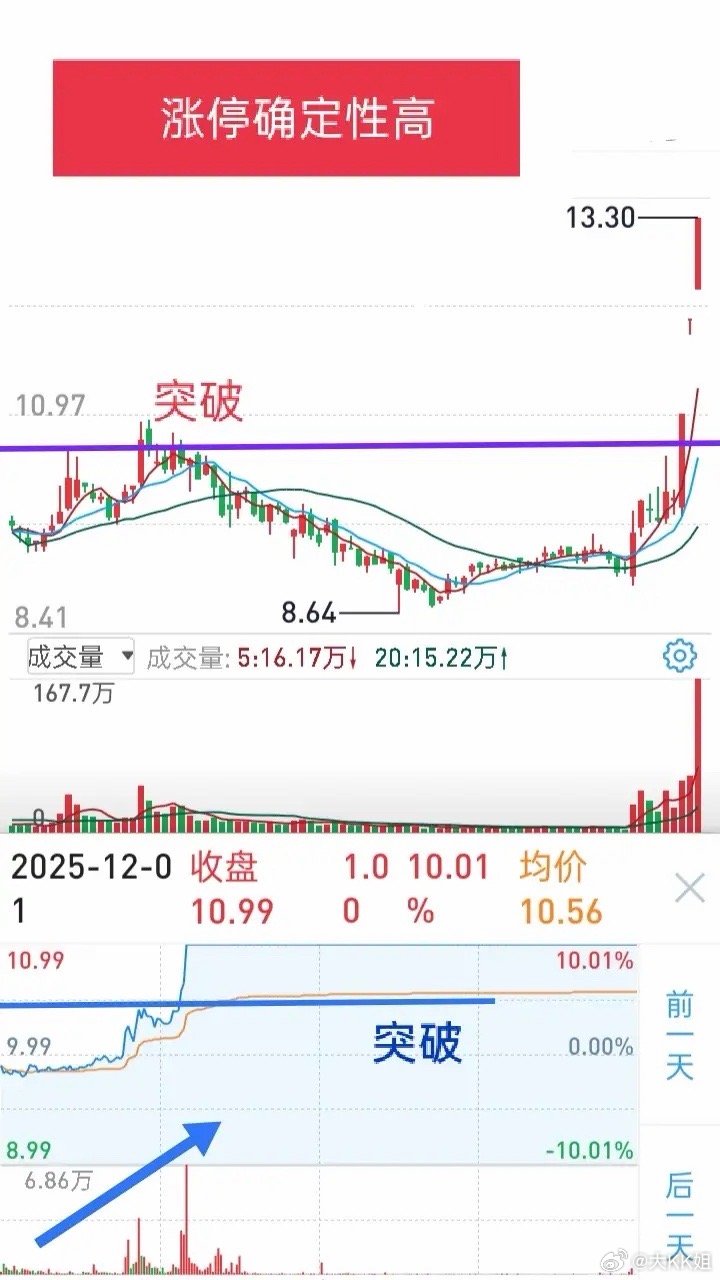 你发的这种形态就非常典型:底部突破、关键阻力位突破、均线多头排列,再配合5日均线上翘,尤其是出现首个涨停板;再看分时图量能持续放大,攻势清晰。这种涨停确定性很高,往往是主升浪启动信号,后面容易走出一波像样行情。